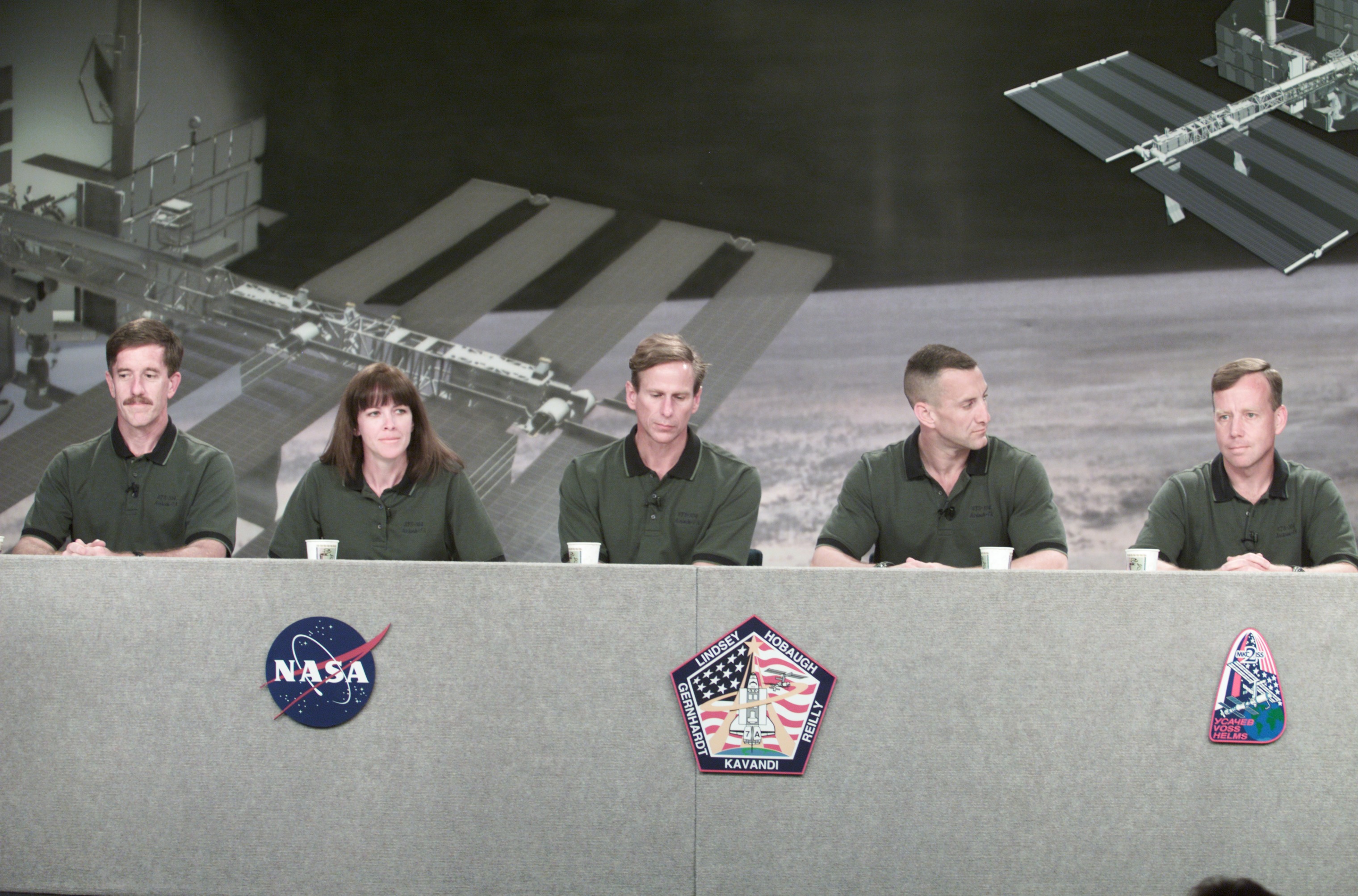 JSC2001-E-19296 (25 June 2001) --- Astronauts James F. Reilly (left), Janet L. Kavandi, Michael L. Gernhardt, all STS-104 mission specialists; along with Charles O. Hobaugh and Steven W. Lindsey, pilot and mission commander, respectively, are photographed during a pre-flight press conference at Johnson Space Center (JSC).