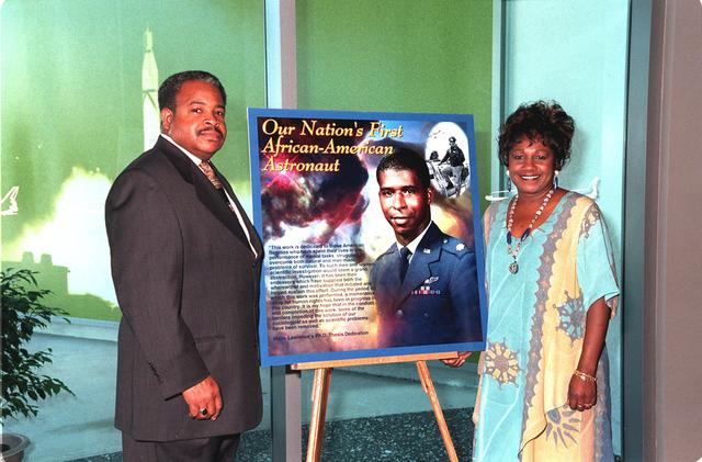 Mack McKinney (left), chief, Programs Resources Management, and Delores Abraham (right), with the Astronaut office, flank one of the posters decorating the Early Space Exploration Conference Center at the KSC Visitor Complex for the 2000 African American History Month Celebration Luncheon. McKinney is chairperson for the event