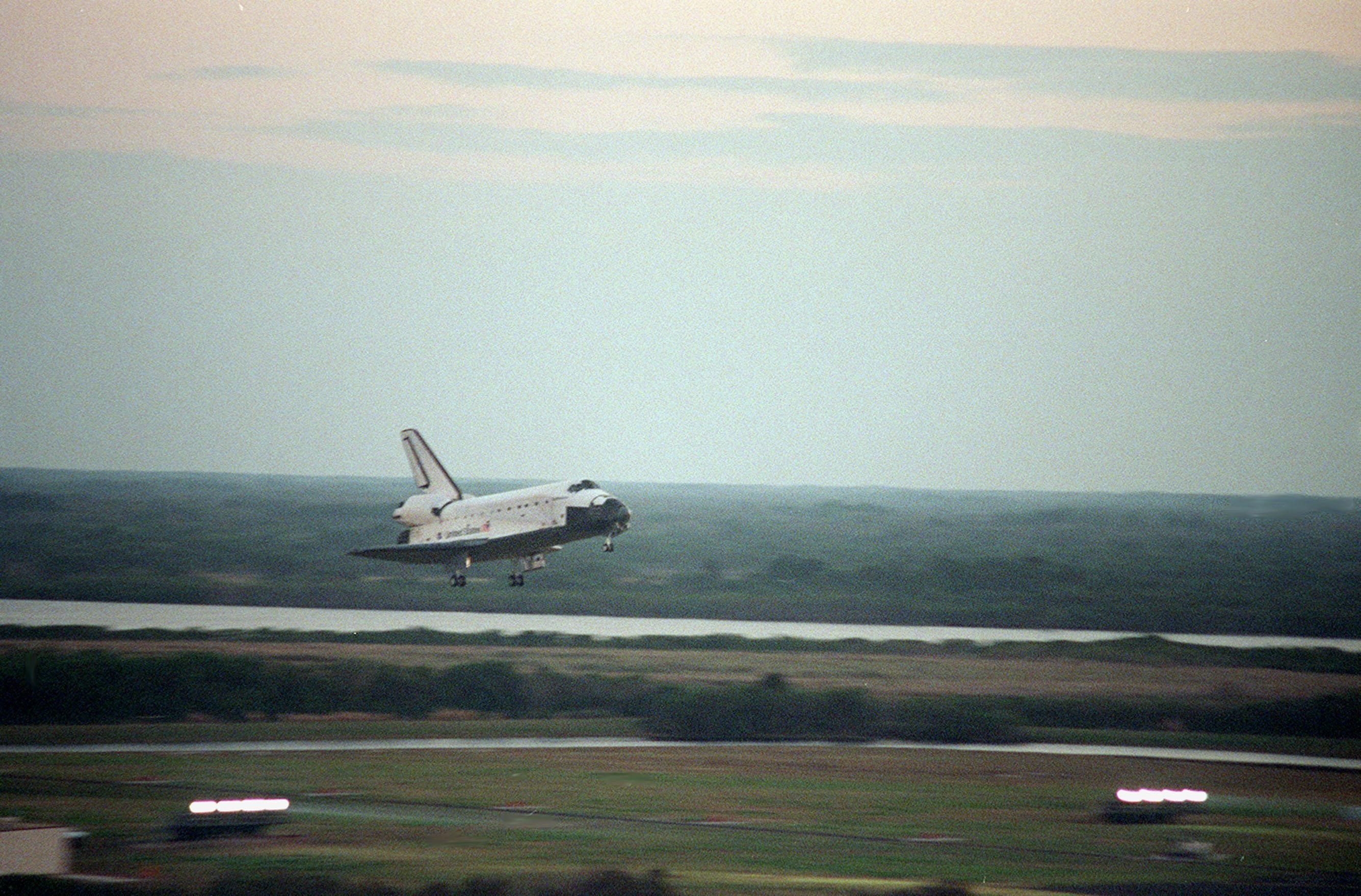 KENNEDY SPACE CENTER, Fla. -- Space Shuttle Endeavour prepares to land on KSC's Shuttle Landing Facility Runway 33 to complete the 11-day, 5-hour, 38-minute-long STS-99 mission. Main gear touchdown was at 6:22:23 p.m. EST Feb. 22 , landing on orbit 181 of the mission. Nose gear touchdown was at 6:22:35 p.m.. EST, and wheel stop at 6:23:25 p.m. EST. At the controls are Commander Kevin Kregel and Pilot Dominic Gorie. Also onboard the orbiter are Mission Specialists Janet Kavandi, Janice Voss, Mamoru Mohri of Japan and Gerhard Thiele of Germany. Mohri is with the National Space Development Agency (NASDA) and Thiele is with the European Space Agency. The crew are returning from the Shuttle Radar Topography Mission, after mapping more than 47 million square miles of the Earth. This was the 97th flight in the Space Shuttle program and the 14th for Endeavour, also marking the 50th landing at KSC, the 21st consecutive landing at KSC, and the 28th in the last 29 Shuttle flights