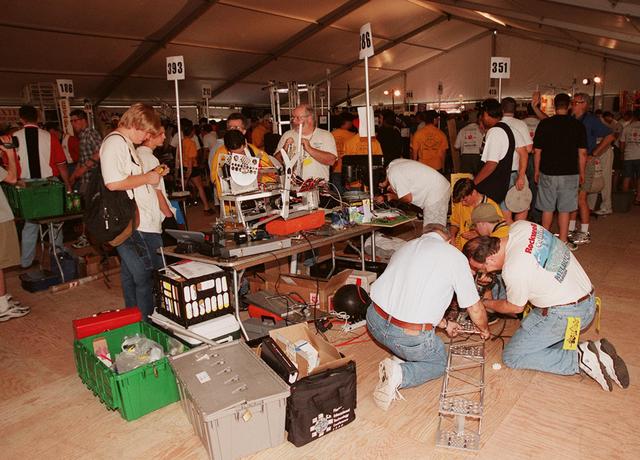 Team 393 from Morristown, Ind., sets up its robot on a table to prepare it for the FIRST (For Inspiration and Recognition of Science and Technology) Southeast Regional competition March 9-11 at the KSC Visitor Complex. KSC is co-sponsoring the team, The Bee Bots, from Morristown Junior and Senior High Schools. On the floor at right is team 386, known as Voltage: The South Brevard First Team. This team is made up of students from Eau Gallie, Satellite, Palm Bay, Melbourne, Bayside and Melbourne Central Catholic High Schools. They are sponsored by KSC as well as Harris Corp., Intersil Corp., Interface & Control Systems. Inc. and Rockwell Collins. Teams of high school students are testing the limits of their imagination using robots they have designed, with the support of business and engineering professionals and corporate sponsors, to compete in a technological battle against other schools' robots. Of the 30 high school teams competing at KSC, 16 are Florida teams co-sponsored by NASA and KSC contractors. Local high schools participating are Astronaut, Bayside, Cocoa Beach, Eau Gallie, Melbourne, Melbourne Central Catholic, Palm Bay, Rockledge, Satellite, and Titusville