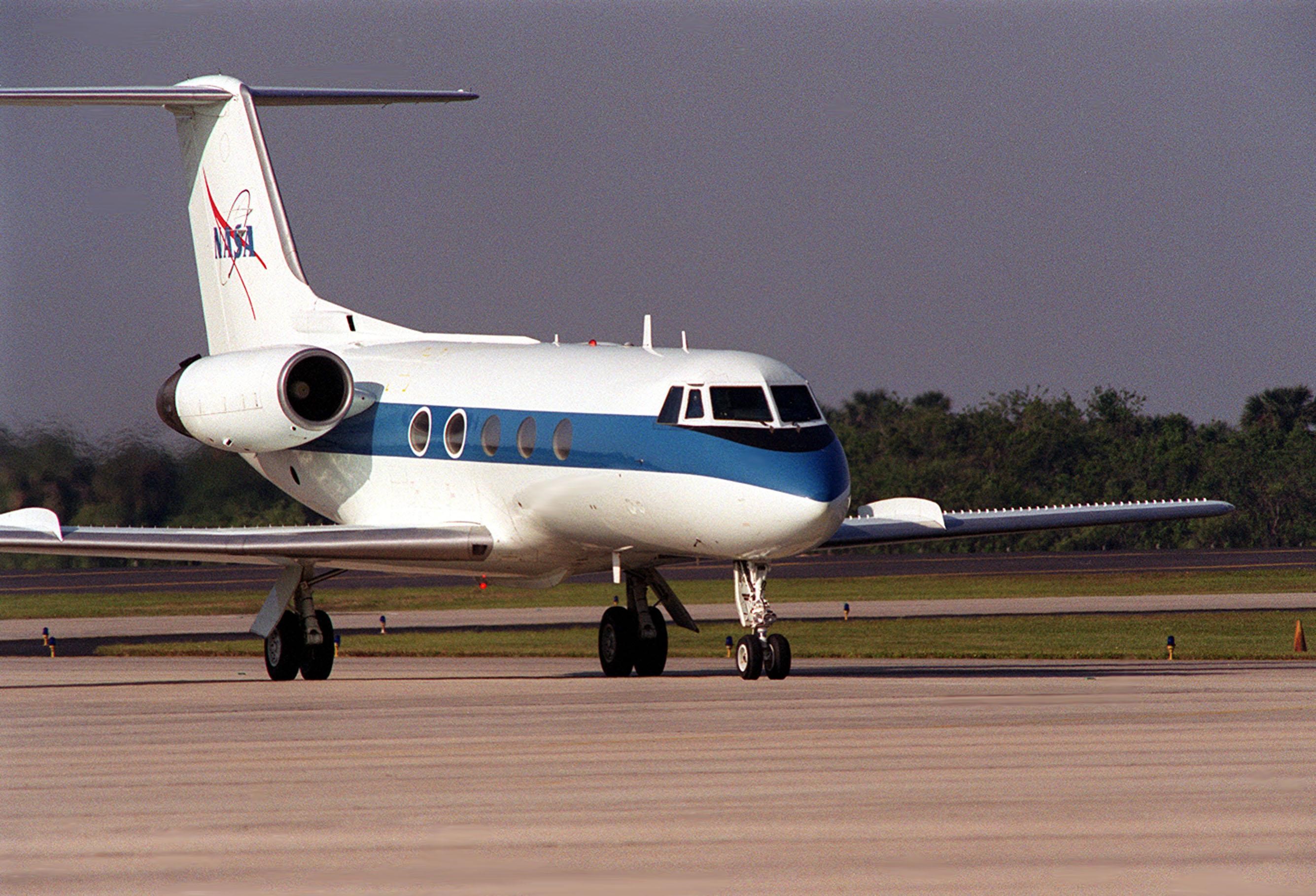 A Shuttle Training Aircraft (STA) taxis into the parking area of KSC's Shuttle Landing Facility. The STA is a modified Grumman American Aviation-built Gulfstream II executive jet that was modified to simulate an orbiter's cockpit, motion and visual cues, and handling qualities. It is used by Shuttle flight crews to practice landing the orbiter. In flight, the STA duplicates the orbiter's atmospheric descent trajectory from approximately 35,000 feet altitude to landing on a runway. The orbiter differs in at least one major aspect from conventional aircraft; it is unpowered during re-entry and landing so its high-speed glide must be perfectly executed the first time there is no go-around capability. The orbiter touchdown speed is 213 to 226 miles (343 to 364 kilometers) per hour. There are two STAs, based in Houston