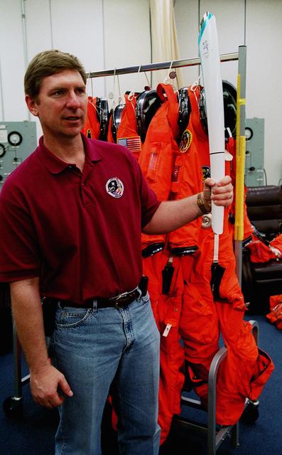 To; Kwiatkowski, Vehicle Integration Team Lead, recovers a replica of the Olympic torch after its journey on Space Shuttle Atlantis on mission STS-101. The addition of the torch to the payload was coordinated by astronaut Andy Thomas, who is from Australia. The torch will travel to Australia for the 2000 Olympic games being held there in September. STS-101 was the third flight to the International Space Station and included repairs to the Station plus transfer of equipment and supplies to the Station for future missions. The landing of Atlantis completed a 9-day, 20-hour, 9-minute-long mission. It was the 98th flight in the Space Shuttle program and the 21st for Atlantis. The landing was the 51st at KSC, the 22nd consecutive landing at KSC and the 29th in the last 30 Shuttle flights, plus the 14th nighttime landing in Shuttle history