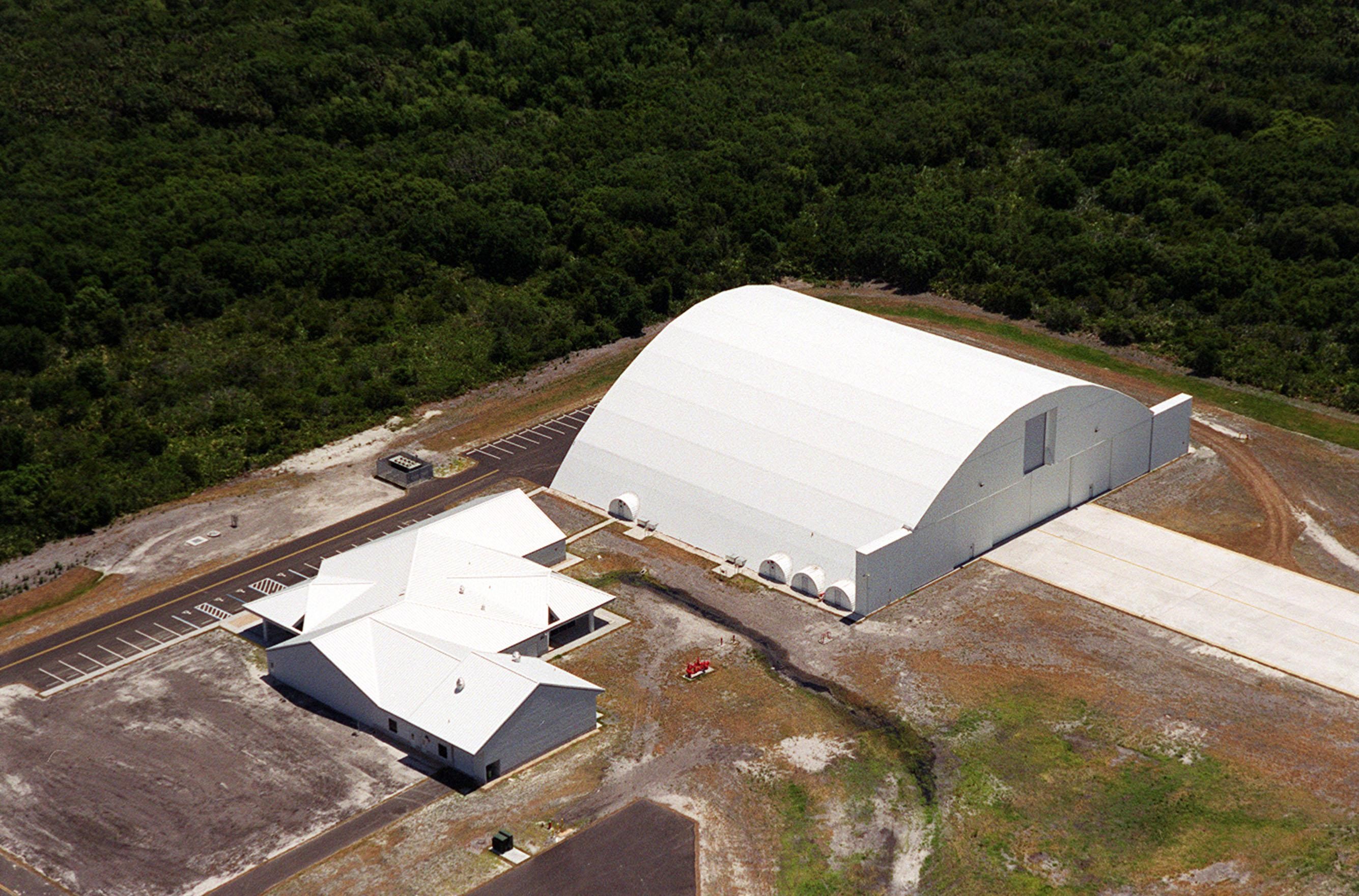 This closeup photo shows the Reusable Launch Vehicle (RLV) Support Complex at Kennedy Space Center. At right is a multi-purpose hangar and to the left is a building for related ground support equipment and administrative/ technical support. The complex is situated at the Shuttle Landing Facility. The RLV complex will be available to accommodate the Space Shuttle; the X-34 RLV technology demonstrator; the L-1011 carrier aircraft for Pegasus and X-34; and other RLV and X-vehicle programs. The complex is jointly funded by the Spaceport Florida Authority, NASA’s Space Shuttle Program and KSC