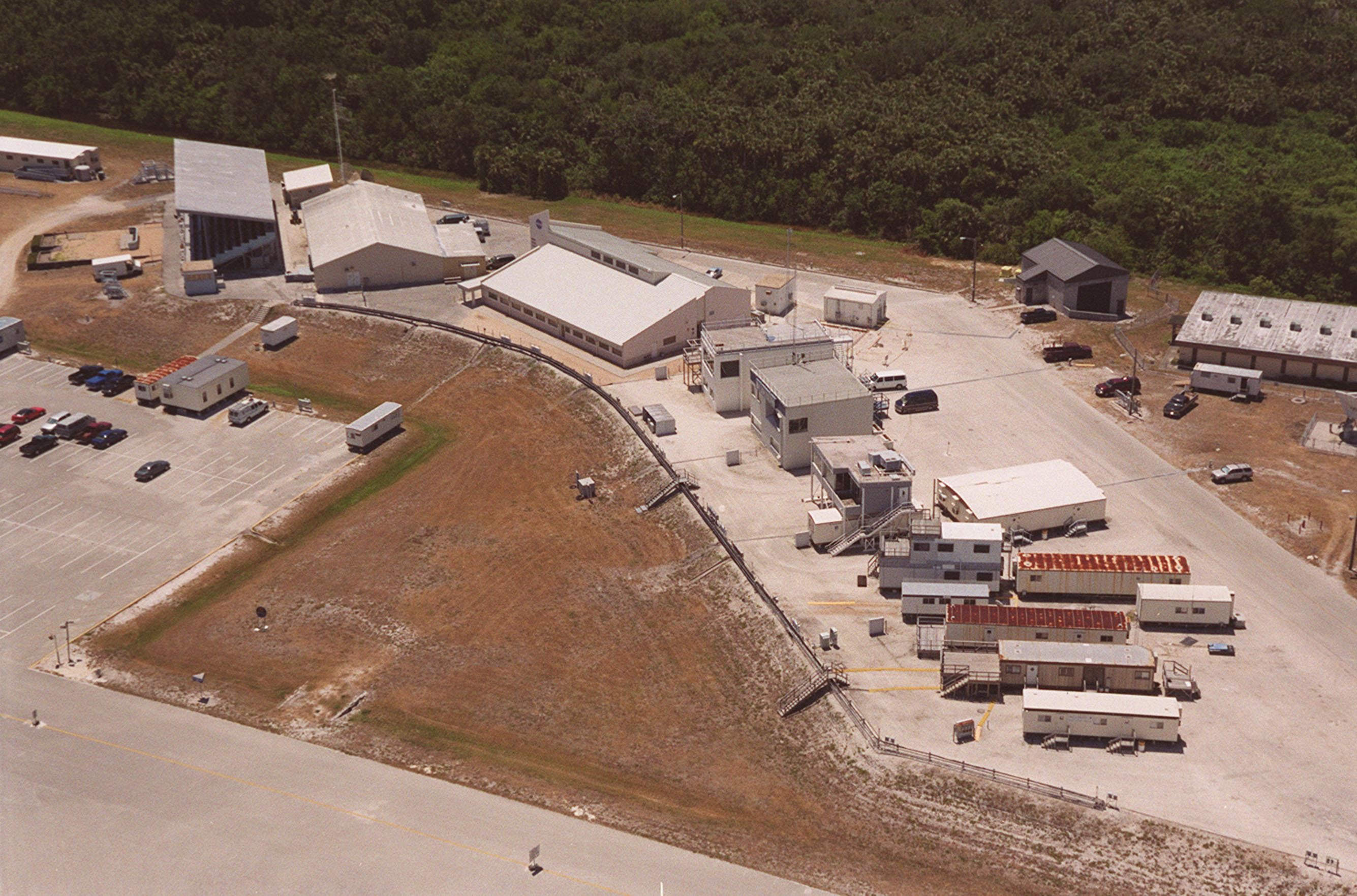 This aerial view is of the buildings that comprise the NASA Press Site in the Launch Complex 39 area. The first large building on the left is the grandstand from which media representatives view the Space Shuttle launches. The building next to it houses the auditorium from which NASA press briefings are broadcast. To its immediate right is the NASA News Center which includes the offices of the NASA spokesmen at Kennedy Space Center. The buildings and trailers to the right of the News Center are assigned to various television stations and news services