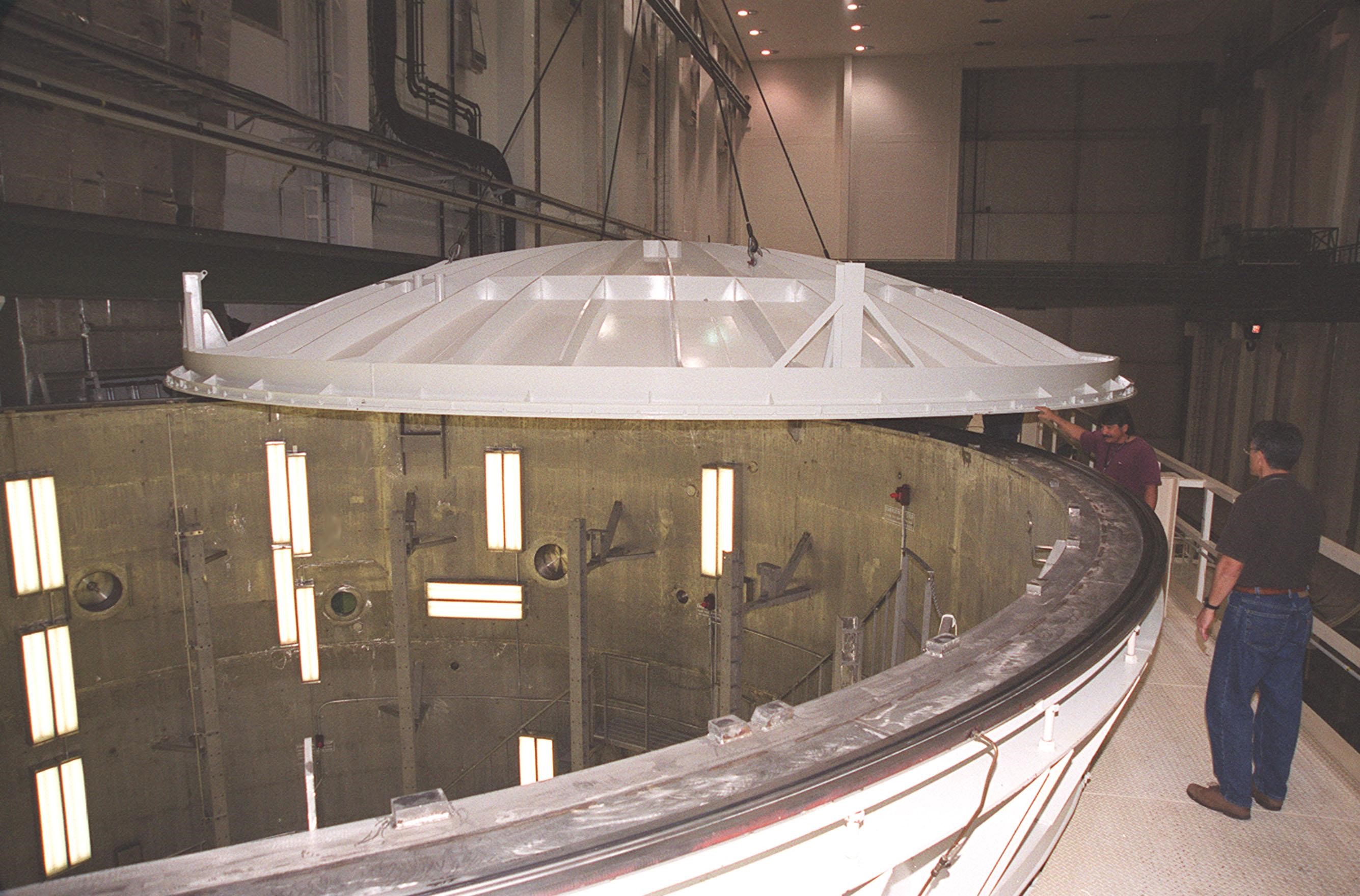 KENNEDY SPACE CENTER, FLA. -- An overhead crane moves the lid over the vacuum chamber containing the U.S. Lab, a component of the International Space Station. The 32,000-pound scientific research lab, named Destiny, is the first Space Station element to spend seven days in the renovated vacuum chamber for a leak test. Destiny is scheduled to be launched on Shuttle mission STS-98, the 5A assembly mission, targeted for Jan. 18, 2001. During the mission, the crew will install the Lab in the Space Station during a series of three space walks. The STS-98 mission will provide the Station with science research facilities and expand its power, life support and control capabilities. The U.S. Lab module continues a long tradition of microgravity materials research, first conducted by Skylab and later Shuttle and Spacelab missions. Destiny is expected to be a major feature in future research, providing facilities for biotechnology, fluid physics, combustion, and life sciences research