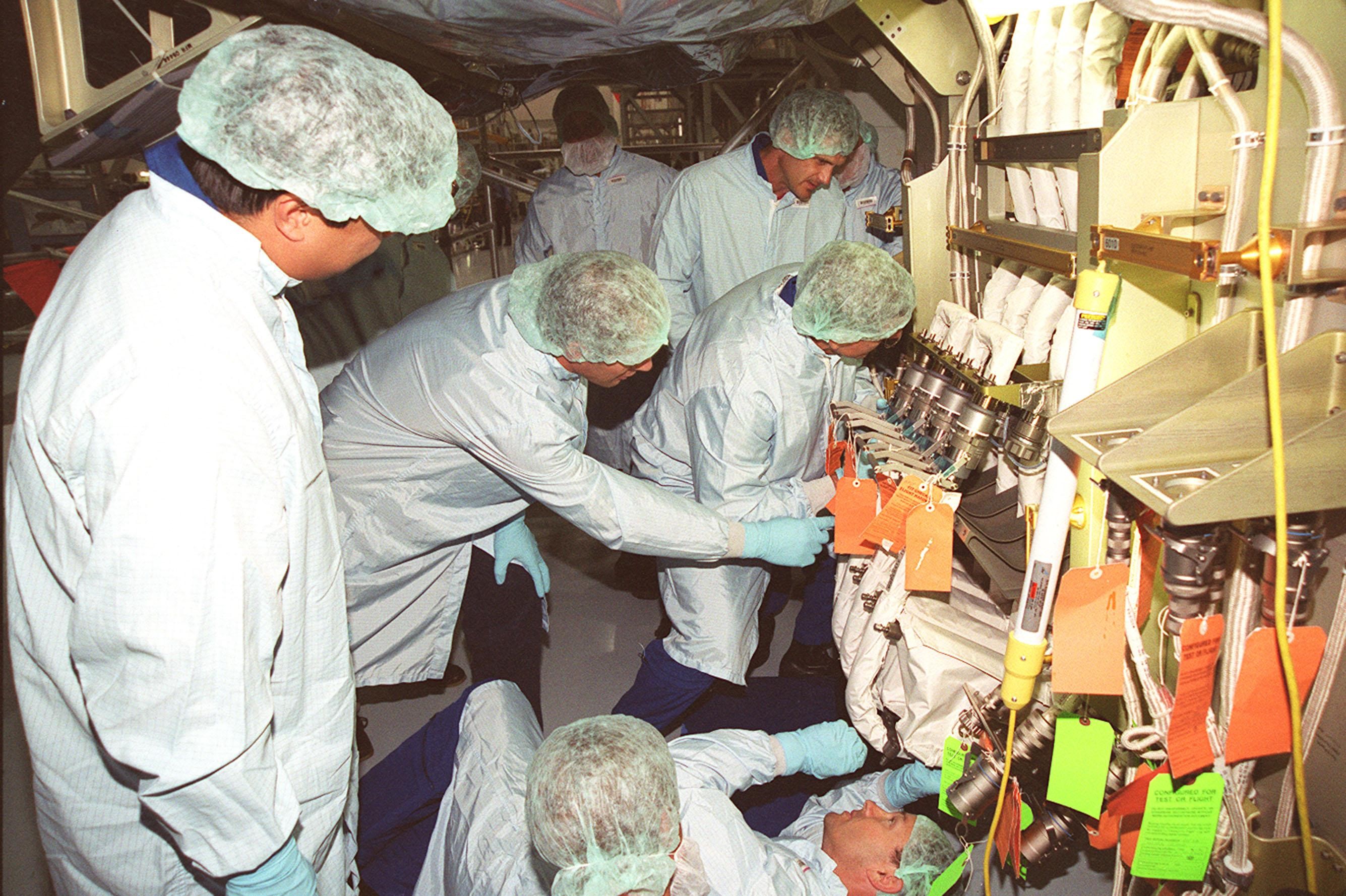 As part of Crew Equipment Interface Test (CEIT) activities, members of the STS-92 crew check out equipment they will be using on the mission to the International Space Station. At left is Mission Specialist Leroy Chiao, looking at part of the Integrated Truss Structure Z1, a component of the Station and payload on STS-92. Others seen in the photo are Mission Specialists Michael Lopez-Alegria (on his back, lower right); Jeff Wisoff (standing in back); and Bill McArthur (bending closer to the Z1 truss). Also taking part in the CIET are Commander Brian Duffy, Pilot Pam Melroy, and Mission Specialist Koichi Wakata. STS-92 is scheduled to launch Oct. 5 from launch Pad 39A