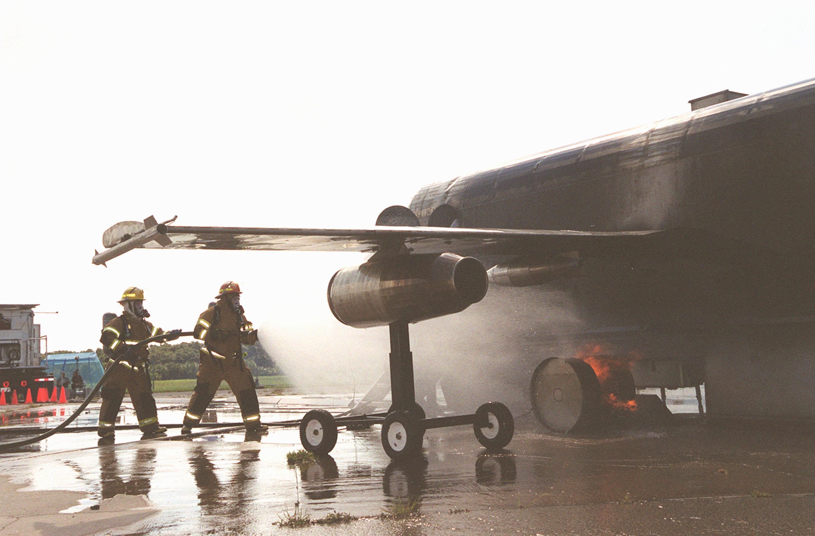 KENNEDY SPACE CENTER, FLA. -- Firefighters in full gear douse a fire on a simulated aircraft. The firefighters, who are with Fire and Emergency Services at the Naval Station Mayport, Fla., are taking part in fire training exercises at Cape Canaveral Air Force Station Pad 30.