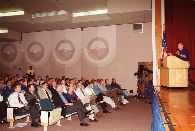 In the Training Auditorium at KSC, Center Director Roy Bridges addresses attendees at a presentation for Super Safety and Health Day. Safety Day is a full day of NASA-sponsored, KSC and 45th Space Wing events involving a number of health and safety related activities: Displays, vendors, technical paper sessions, panel discussions, a keynote speaker, etc. The entire Center and Wing stand down to participate in the planned events. Safety Day is held annually to proactively increase awareness in safety and health among the government and contractor workforce population. The first guiding principle at KSC is “Safety and Health First.” KSC’s number one goal is to “Assure sound, safe and efficient practices and processes are in place for privatized/commercialized launch site processing.