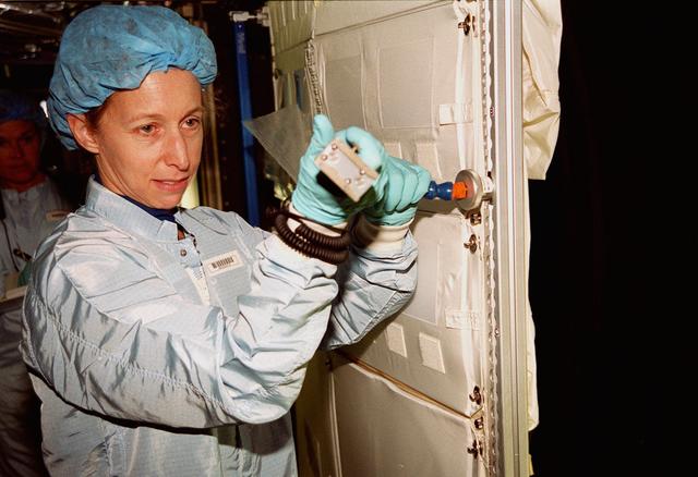 In the Space Station Processing Facility, STS-98 Mission Specialist Marsha Ivins wields a tool on part of the U.S. Lab, Destiny. The crew is checking out equipment inside the lab as part of Crew Equipment Interface Test activities, becoming familiar with equipment it will be handling during the mission. Others in the crew are Commander Ken Cockrell, Pilot Mark Polansky and Mission Specialists Robert Curbeam and Thomas Jones. The mission will be transporting the Lab to the International Space Station with five system racks already installed inside of the module. With delivery of electronics in the lab, electrically powered attitude control for Control Moment Gyroscopes will be activated. The STS-98 launch is scheduled for Jan. 18, 2001
