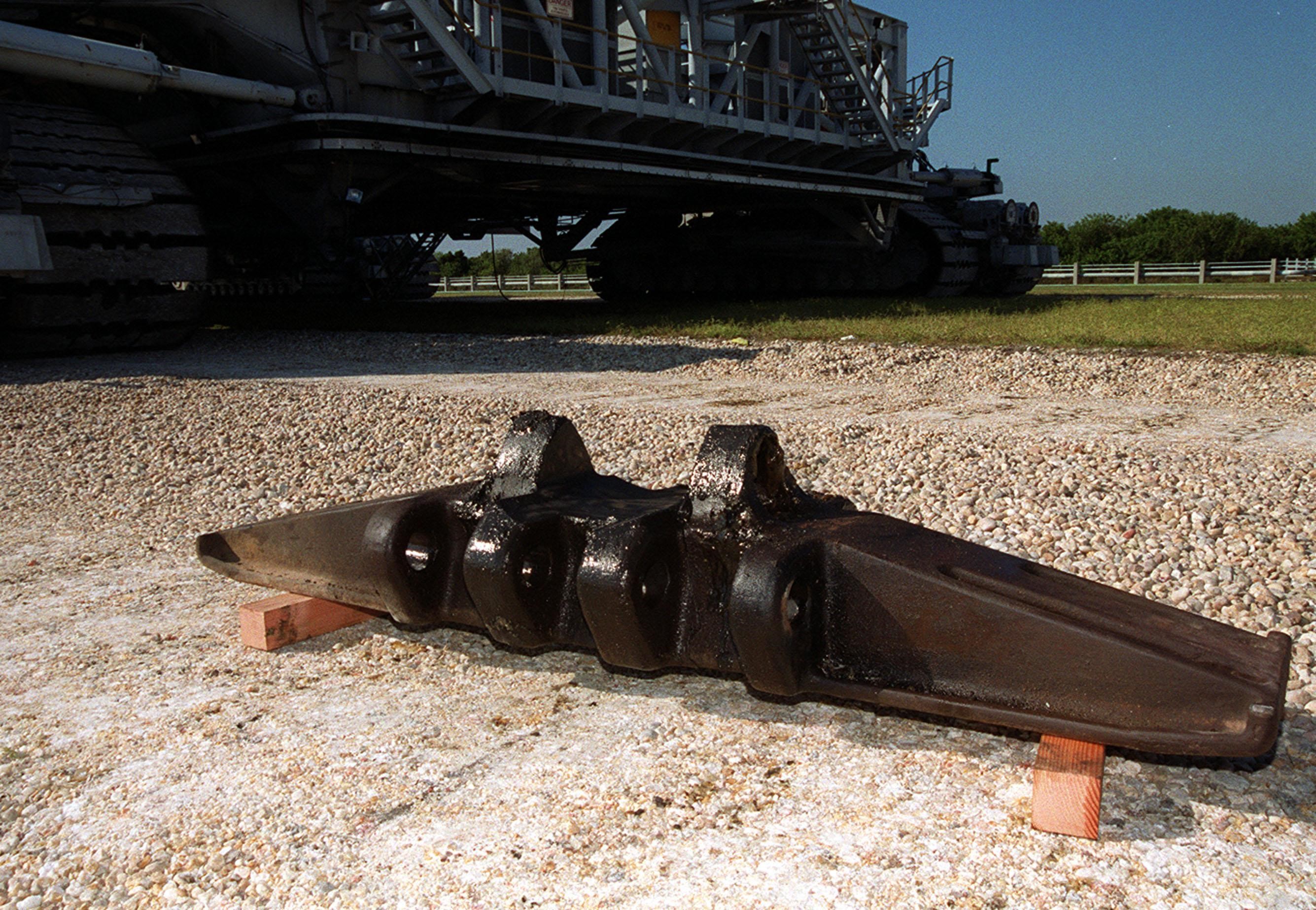 A new cleat, or shoe, for one of the tracks on the crawler-transporter sits on the ground near the vehicle (in the background). A cracked cleat was noticed on the crawler as it was rolling Space Shuttle Endeavour and the Mobile Launcher Platform out to Launch Pad 39B. The rollout is being suspended while the cleat is replaced. Endeavour is scheduled to be launched Nov. 30 at 10:01 p.m. EST on mission STS-97, the sixth construction flight to the International Space Station. Its payload includes the P6 Integrated Truss Structure and a photovoltaic (PV) module, with giant solar arrays that will provide power to the Station. The mission includes two spacewalks to complete the solar array connections