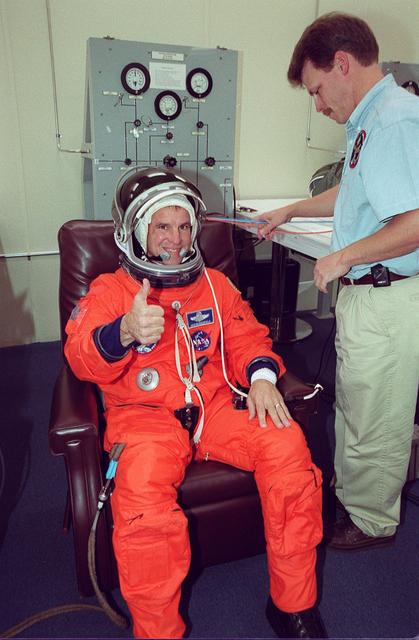 STS-97 Pilot Michael Bloomfield signals thumbs up for launch after donning his launch and entry suit. This is his second Shuttle flight. Mission STS-97 is the sixth construction flight to the International Space Station. It is transporting the P6 Integrated Truss Structure that comprises Solar Array Wing-3 and the Integrated Electronic Assembly, to be installed on the Space Station. The solar arrays are mounted on a “blanket” that can be folded like an accordion for delivery. Once in orbit, astronauts will deploy the blankets to their full size. The 11-day mission includes two spacewalks to complete the solar array connections. The Station’s electrical power system will use eight photovoltaic solar arrays, each 112 feet long by 39 feet wide, to convert sunlight to electricity. Gimbals will be used to rotate the arrays so that they will face the Sun to provide maximum power to the Space Station. Launch is scheduled for Nov. 30 at 10:06 p.m. EST