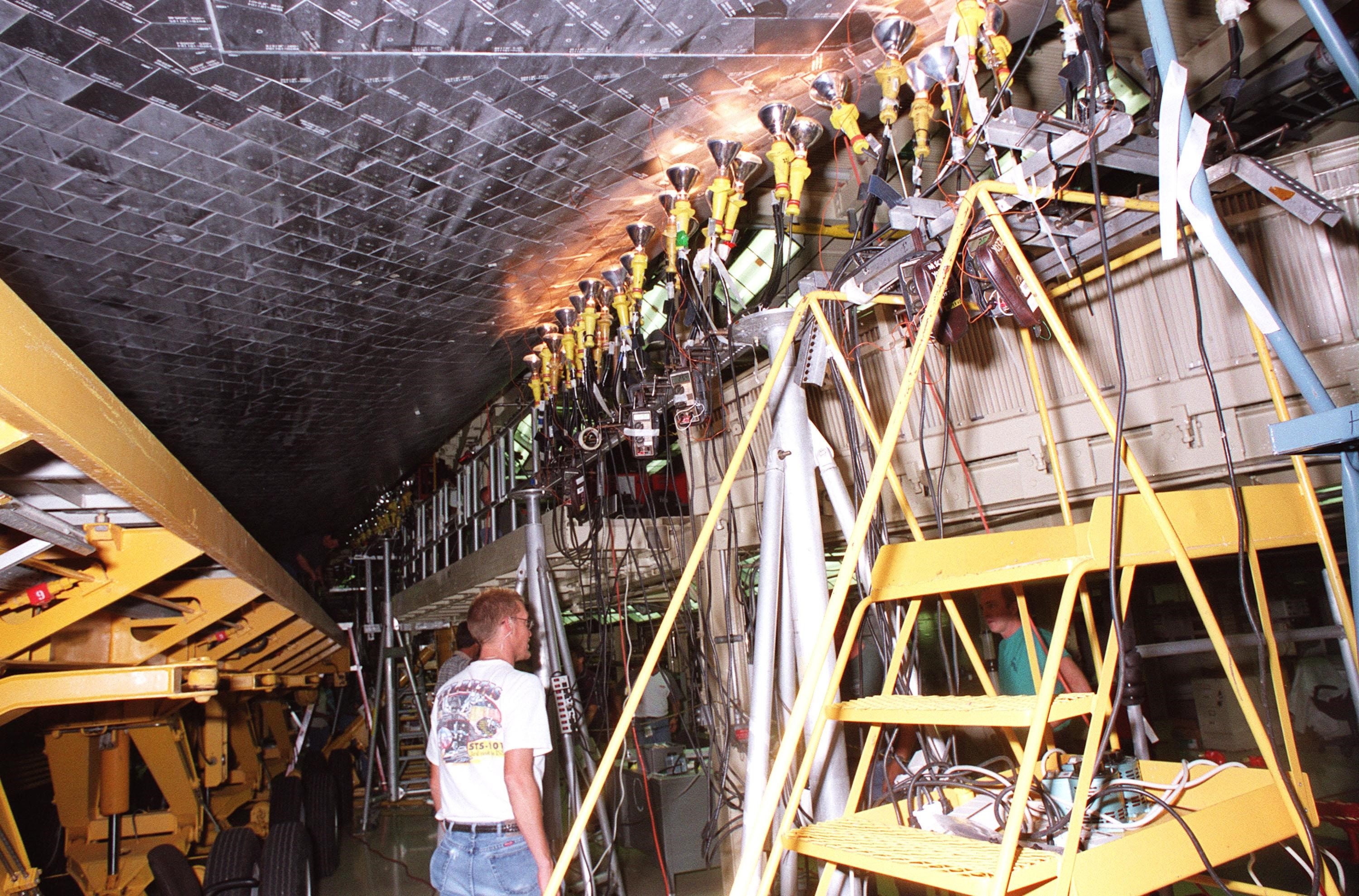 KENNEDY SPACE CENTER, FLA. -- In the Orbiter Processing Facility, a worker points to some of the tiles on orbiter Atlantis that are being dried by clusters of 200-300 watt heat lamps. Significant rainstorms during the orbiter’s turnaround for a ferry flight home from Edwards Air Force Base, Calif., caused a moisture problem. The tiles are part of the Thermal Protection System used on orbiters for extreme temperatures encountered during landing. Engineers are evaluating the current procedures to assure the tiles are in a safe and flight-ready condition