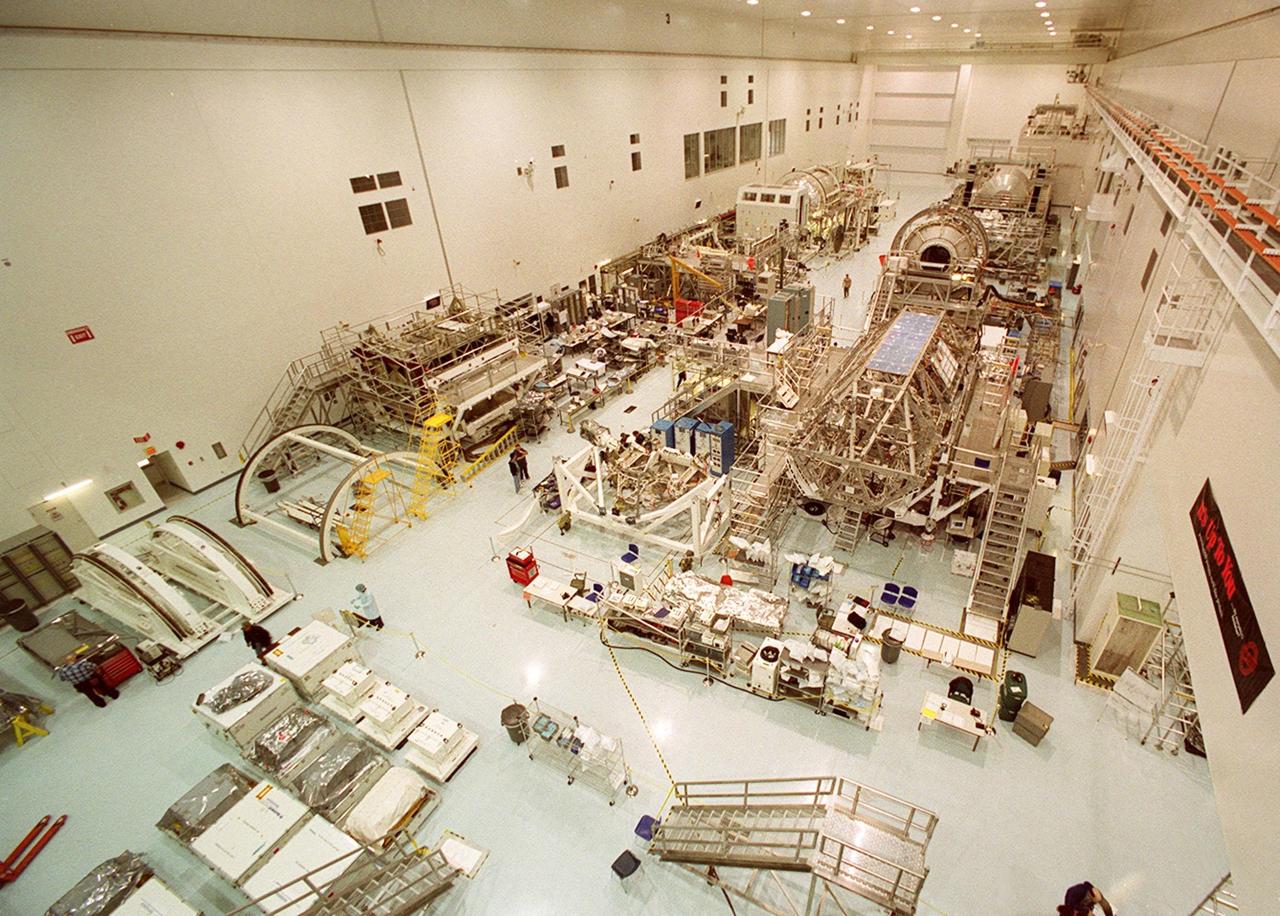 An overview of the Space Station Processing Facility shows equipment and future payloads on Shuttle missions to the International Space Station. At left is a Multi-Purpose Logistics Module Raffaello; at right another MPLM, Donatello. Windows on the wall at right give visitors on bus tours a look at operations during the day