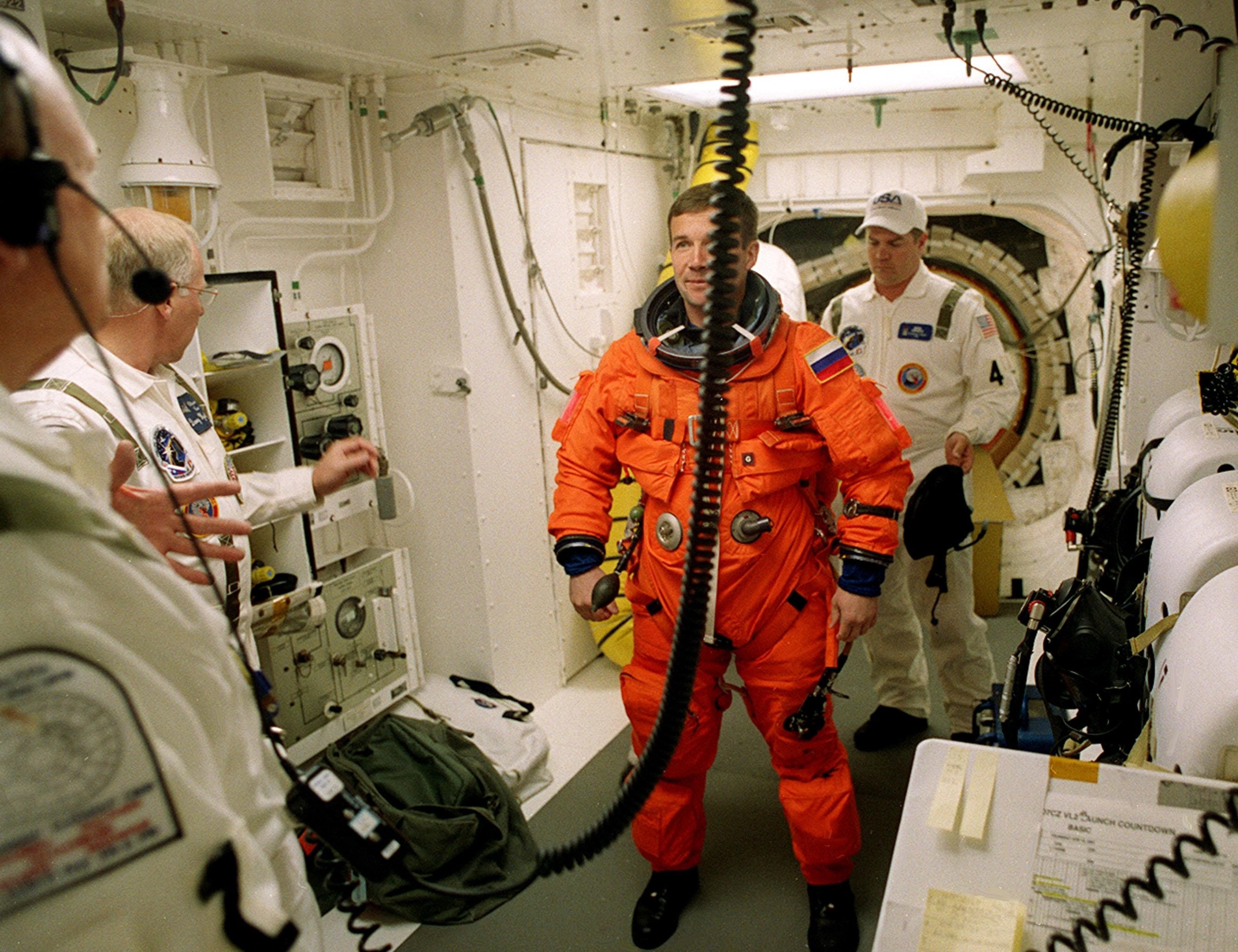 In the White Room, STS-100 Mission Specialist Yuri V. Lonchakov (center) is checked by closeout crew members (from left) Greg Johnson, Danny Wyatt and Rene Arriens before entering Space Shuttle Endeavour. The White Room is an environmental chamber at the end of the Orbiter Access Arm that provides entry into the orbiter on the launch pad. The mission will deliver and integrate the Spacelab Logistics Pallet/Launch Deployment Assembly, which includes the Canadian-built Space Station Remote Manipulator System and the UHF Antenna. Two spacewalks are planned for installation of the SSRMS, which will be performed by Mission Specialists Scott E. Parazynski and Chris A. Hadfield, who is with the Canadian Space Agency. The mission is also the inaugural flight of Multi-Purpose Logistics Module Raffaello, carrying resupply stowage racks and resupply/return stowage platforms. Liftoff of Space Shuttle Endeavour on mission STS-100 is scheduled at 2:41 p.m. EDT April 19