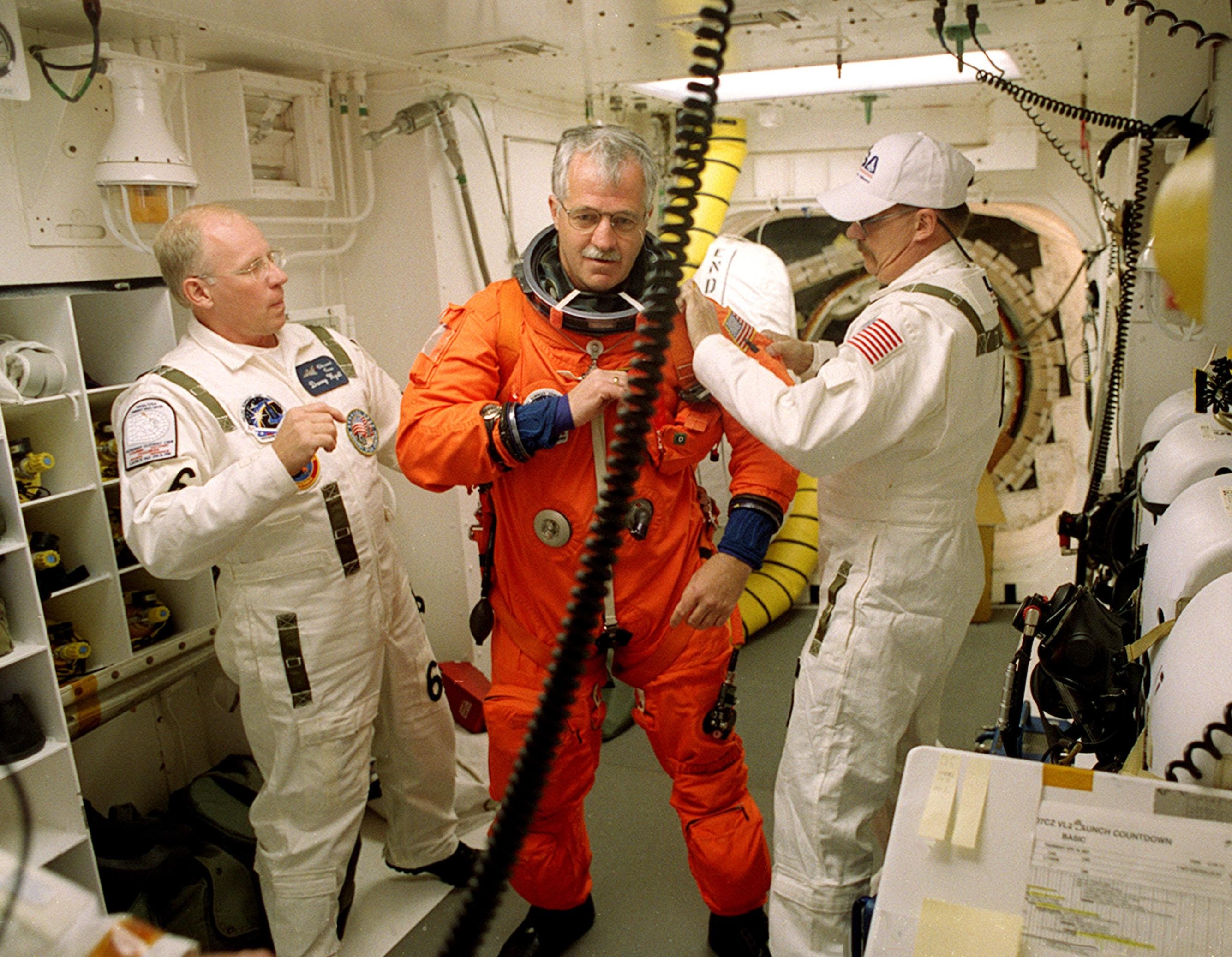 In the White Room, STS-100 Mission Specialist John L. Phillips is helped with his launch and entry suit by closeout crew members Danny Wyatt (left) and George Schramm (right). This is Phillips’ first Shuttle launch. The White Room is an environmental chamber at the end of the Orbiter Access Arm that provides entry into the orbiter on the launch pad. The mission will deliver and integrate the Spacelab Logistics Pallet/Launch Deployment Assembly, which includes the Canadian-built Space Station Remote Manipulator System and the UHF Antenna. Two spacewalks are planned for installation of the SSRMS, which will be performed by Mission Specialists Scott E. Parazynski and Chris A. Hadfield, who is with the Canadian Space Agency. The mission is also the inaugural flight of the Multi-Purpose Logistics Module Raffaello, carrying resupply stowage racks and resupply/return stowage platforms. Liftoff of Space Shuttle Endeavour on mission STS-100 is scheduled at 2:41 p.m. EDT April 19