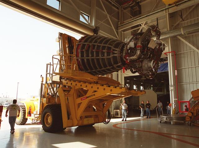 KENNEDY SPACE CENTER, FLA. -- The transport vehicle carrying a new block 2 engine leaves the Space Station Main Engine Processing Facility for a short trip to Orbiter Processing Facility bay 3. The new engine will be installed on the orbiter Atlantis, on mission STS-104, for its first flight. The Block II Main Engine configuration is manufactured by Boeing Rocketdyne in Canoga Park, Calif., and includes a new Pratt & Whitney high-pressure fuel turbo pump. Engine improvements are managed by NASA’s Marshall Space Flight Center in Huntsville, Ala. Each Space Shuttle Main Engine is 14 feet (4.3 meters) long, weighs about 7,000 pounds (3,175 kilograms), and is 7.5 feet (2.3 meters) in diameter at the end of the nozzle