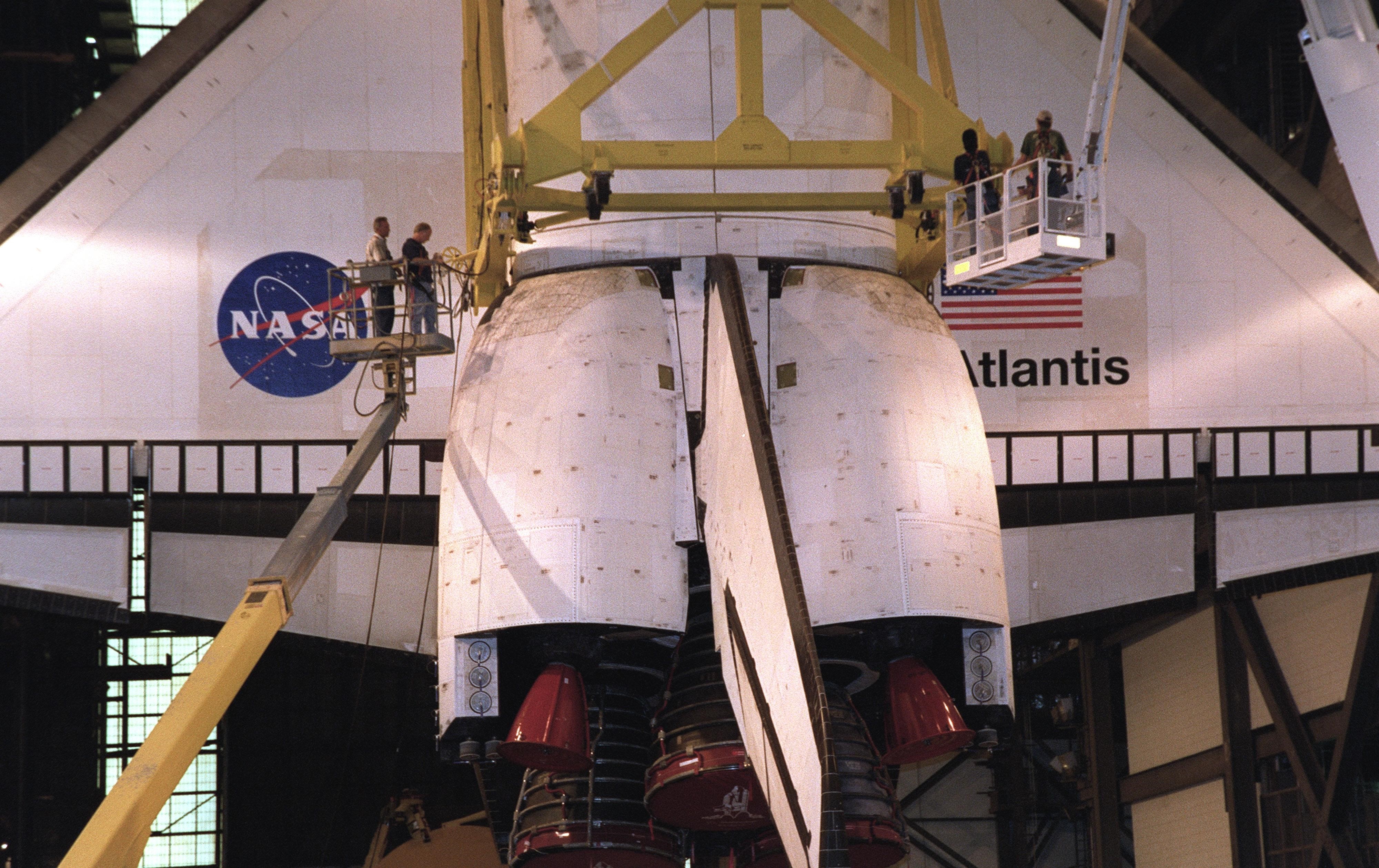 KENNEDY SPACE CENTER, FLA. -- This closeup shows the workers, standing on lifts, who are checking the bolts on the apparatus holding the orbiter Atlantis. The orbiter will be rotated and lifted into high bay 1 where it will be stacked with its external tank and solid rocket boosters. Space Shuttle Atlantis is scheduled to launch on mission STS-104 in early July