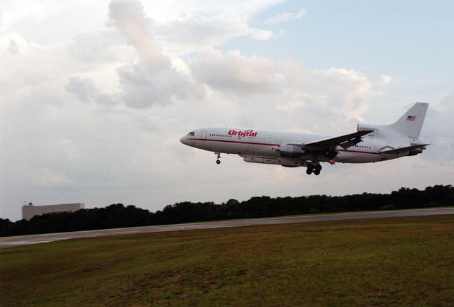 KENNEDY SPACE CENTER, Fla. -- An L-1011 aircraft called the Stargazer gets ready to land at the Skid Strip, Cape Canaveral Air Force Station. Underneath its belly it carries the Orbital Sciences Corp. Pegasus XL launch vehicle with the High Energy Solar Spectroscopic Imager (HESSI) attached. The Pegasus XL will launch the HESSI no earlier than June 12 from CCAFS. The primary mission of HESSI is to explore the basic physics of particle acceleration and energy release in solar flares