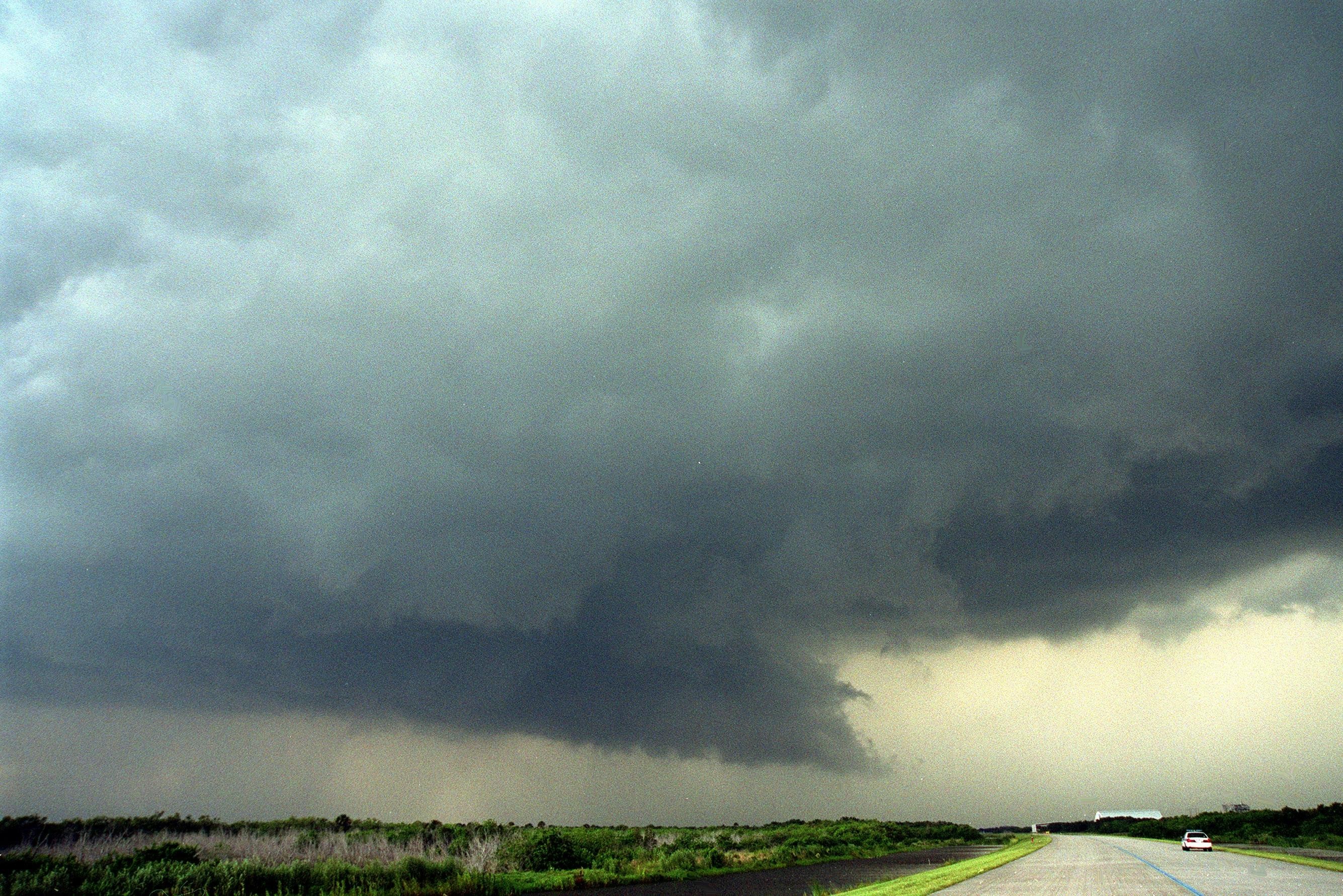 KENNEDY SPACE CENTER, Fla. -- Dark clouds and strong winds seem almost to touch the ground near the tow-way leading from the Shuttle Landing Facility (SLF). In the background (right) can be seen the new hangar at the SLF and the mate/demate device. The cloud formation is proceeding across the SLF towards the Vehicle Assembly Building