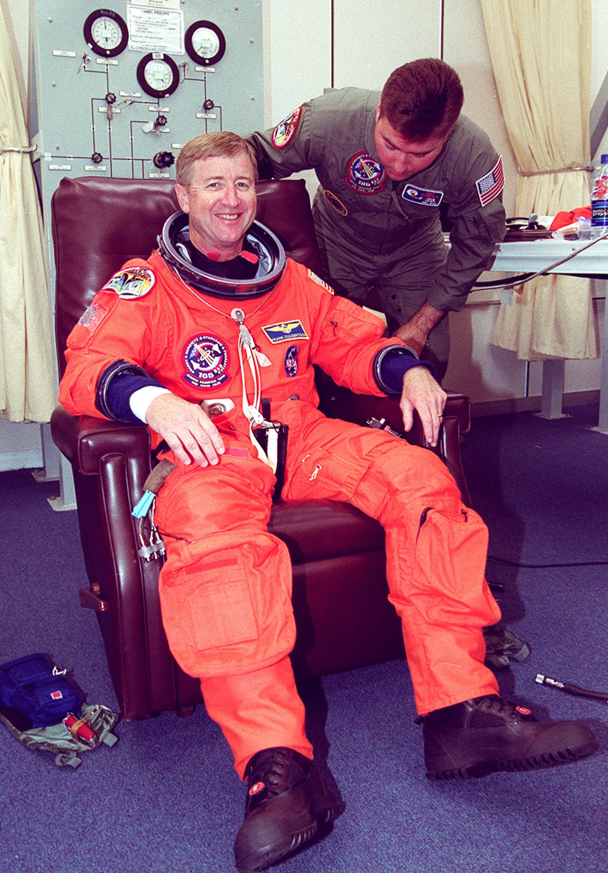 KENNEDY SPACE CENTER, Fla. -- Expedition Three Commander Frank Culbertson is helped with his launch and entry suit for the second launch attempt after a 24-hour weather delay. Launch countdown activities for the 12-day mission were called off at about 5:12 p.m. Aug. 9 during the T-9 minute hold due to the high potential for lightning, a thick cloud cover and the potential for showers. Launch is currently scheduled for 5:15 p.m. EDT Aug. 10. Highlighting the mission will be the rotation of the International Space Station crew, the third flight of an Italian-built Multi-Purpose Logistics Module delivering additional scientific racks, equipment and supplies for the Space Station, and two spacewalks. Included in the payload is the Early Ammonia Servicer (EAS) tank, which will be attached to the Station during the spacewalks. The EAS will be installed on the P6 truss, which holds the Station’s giant U.S. solar arrays, batteries and the cooling radiators. The EAS contains spare ammonia for the Station’s cooling system. The three-member Expedition Two crew will be returning to Earth aboard Discovery after a five-month stay on the Station