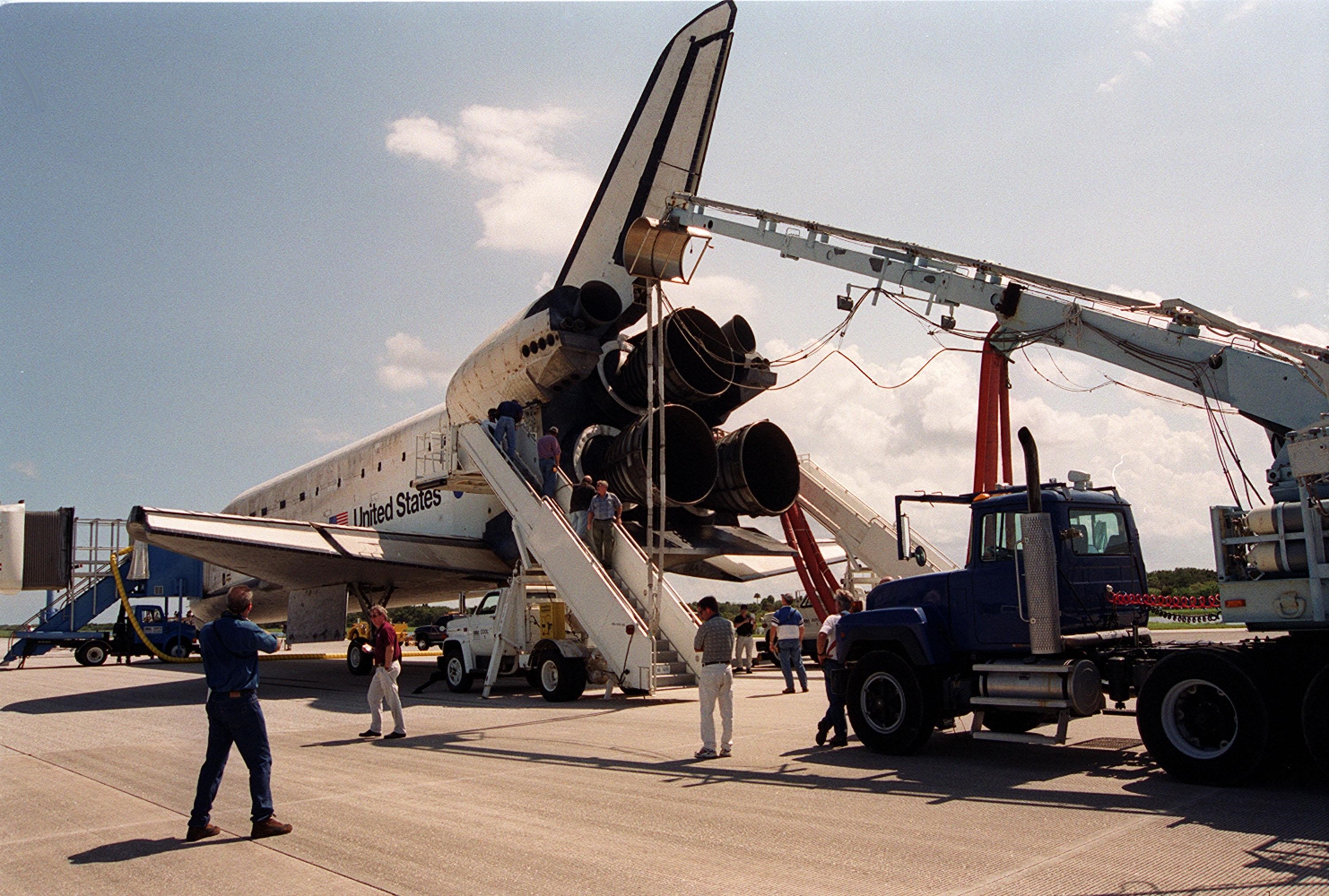 KENNEDY SPACE CENTER, Fla. -- On KSC’s Shuttle Landing Facility runway 15 following mission STS-105, orbiter Discovery undergoes safing operations such as being checked for toxic or hazardous gases, and having purge air introduced to cool the vehicle and humidified air conditioning to the payload bay and other cavities to remove any residual explosive or toxic fumes that may be present. The operations include preparing the orbiter for ground tow operations, installing switch guards and removing data packages from any onboard experiments. Main gear touchdown was at 2:22:58 p.m. EDT; wheel stop, at 2:24:06 p.m. EDT. The 11-day, 21-hour, 12-minute mission accomplished the goals set for the 11th flight to the International Space Station: swapout of the resident Station crew; delivery of equipment, supplies and scientific experiments; and installation of the Early Ammonia Servicer and heater cables for the S0 truss on the Station. Discovery traveled 4.3 million miles on its 30th flight into space, the 106th mission of the Space Shuttle program. Out of five missions in 2001, the landing was the first to occur in daylight at KSC