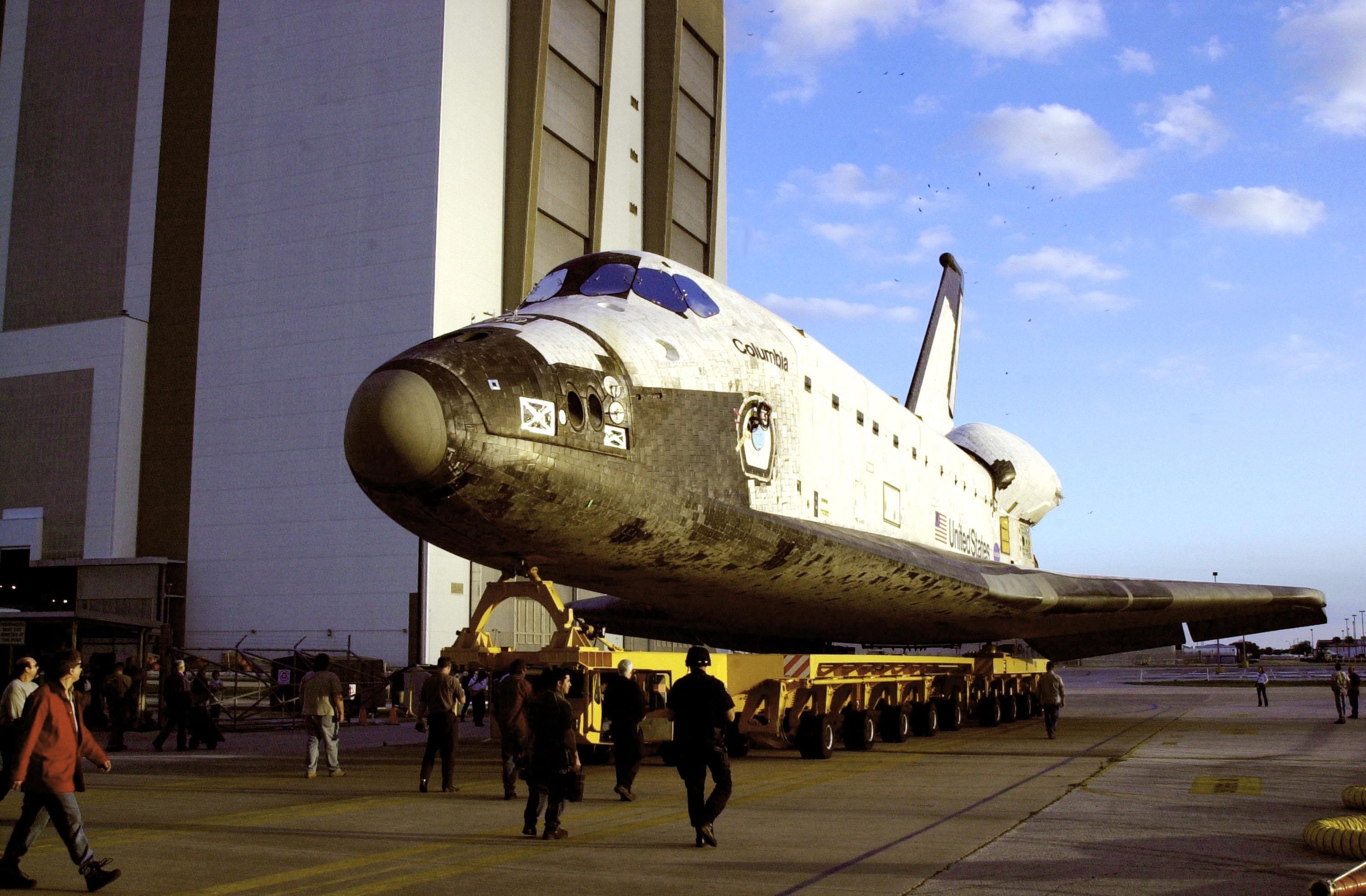 KENNEDY SPACE CENTER, FLA. -- After leaving the Orbiter Processing Facility, orbiter Columbia rolls toward the Vehicle Assembly Building where it will be mated with the external tank-solid rocket booster stack. Columbia is scheduled to be launched Feb. 28 on mission STS-109, a Hubble Servicing Mission. The goal of the mission is to service the HST, replacing Solar Array 2 with Solar Array 3, replacing the Power Control Unit, removing the Faint Object Camera and installing the ACS, installing the Near Infrared Camera and Multi-Object Spectrometer (NICMOS) Cooling System, and installing New Outer Blanket Layer insulation