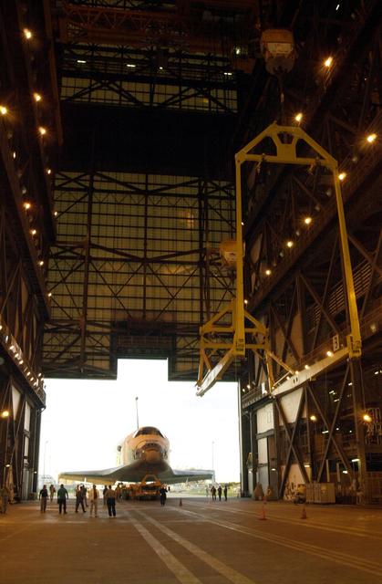 KENNEDY SPACE CENTER, FLA. -- The orbiter Columbia rolls into the transfer aisle of the Vehicle Assembly Building where it will be mated with the external tank-solid rocket booster stack. Columbia is scheduled to be launched Feb. 28 on mission STS-109, a Hubble Servicing Mission. The goal of the mission is to service the HST, replacing Solar Array 2 with Solar Array 3, replacing the Power Control Unit, removing the Faint Object Camera and installing the ACS, installing the Near Infrared Camera and Multi-Object Spectrometer (NICMOS) Cooling System, and installing New Outer Blanket Layer insulation