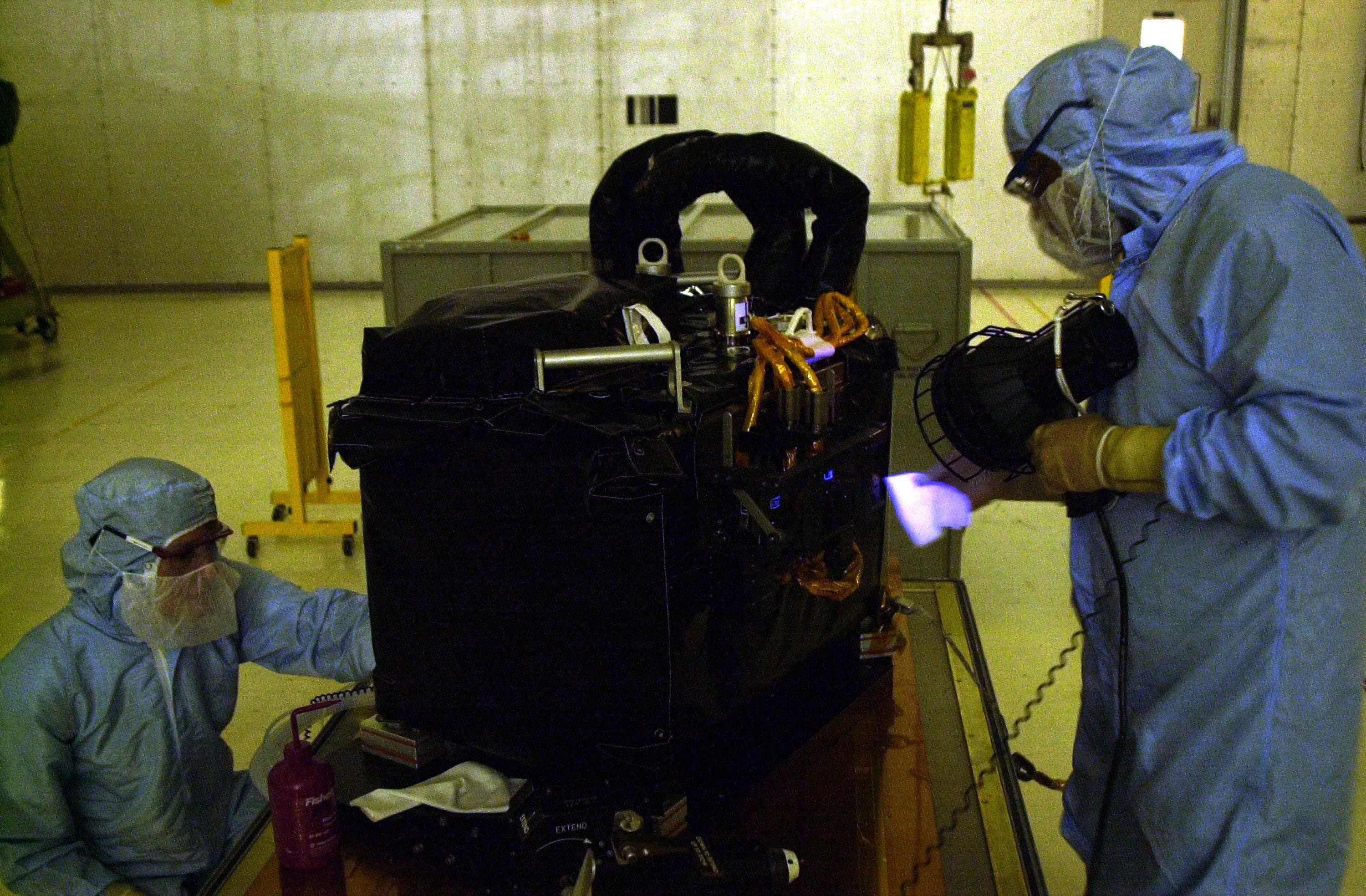 KENNEDY SPACE CENTER, FLA. -- Workers in the Vertical Processing Facility test the Near Infrared Camera and Multi-Object Spectrometer (NICMOS) Cooling System, part of the payload on mission STS-109, the Hubble Servicing Telescope Mission. The worker at right is using a black light. NICMOS II is a new experimental cooling system consisting of a compressor and tiny turbines. With the experimental cryogenic system, NASA hopes to re-cool the infrared detectors to below -315 degrees F (-193 degrees Celsius). NICMOS II was previously tested aboard STS-95 in 1998. It could extend the life of the Hubble Space Telescope by several years. Astronauts aboard Columbia on mission STS-109 will be replacing the original NICMOS with the newer version. Launch of mission STS-109 is scheduled for Feb. 28, 2002