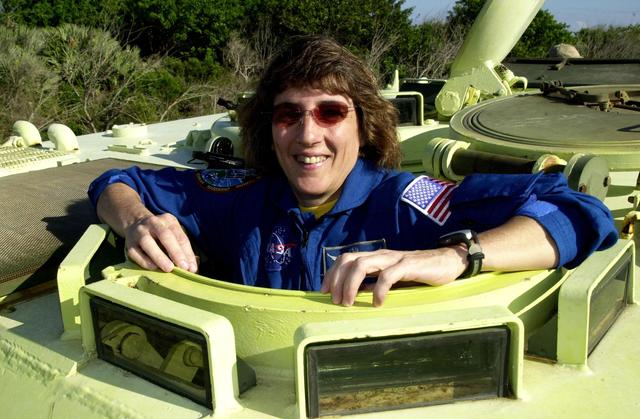 KENNEDY SPACE CENTER, FLA. - STS-109 Mission Specialist Nancy Currie is ready to practice driving the M-113 armored personnel carrier, part of emergency egress training at the launch pad. Crew members are taking part in Terminal Countdown Demonstration Test activities, which also include a simulated launch countdown. STS-109 is a Hubble Space Telescope Servicing Mission, with goals to replace Solar Array 2 with Solar Array 3, replace the Power Control Unit, remove the Faint Object Camera and install the Advanced Camera for Surveys (ACS), install the Near Infrared Camera and Multi-Object Spectrometer (NICMOS) Cooling System, and install New Outer Blanket Layer insulation. The 11-day mission will require grasping the satellite with a robotic arm in order for the crew to perform the tasks during five spacewalks. Launch of STS-109 aboard Space Shuttle Columbia is scheduled for Feb. 28, 2002