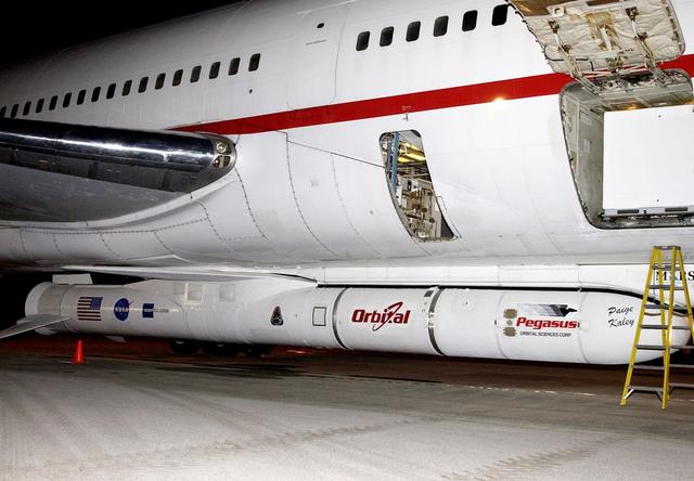KENNEDY SPACE CENTER, FLA. -- This closeup shows the Pegasus XL rocket with the High Energy Solar Spectroscopic Imager (HESSI) attached at its top, on the right. The Pegasus will launch HESSI to explore the basic physics of particle acceleration and energy release in solar flares. The launch is scheduled for Feb. 5, 2002, from beneath the Orbital Sciences Corp. L-1011 aircraft seen here