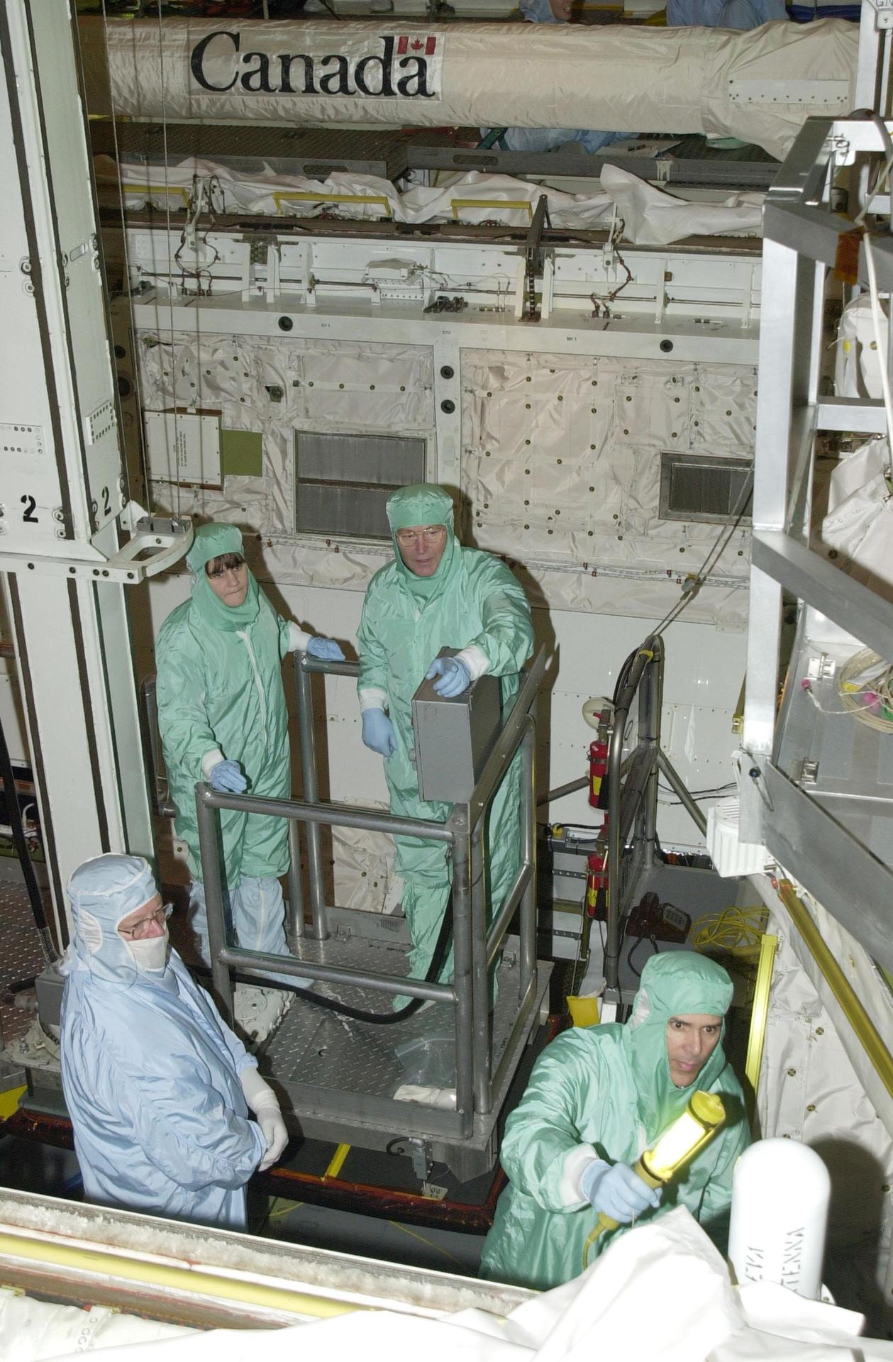 KENNEDY SPACE CENTER, FLA. -- In the Orbiter Processing Facility, STS-110 Mission Specialists Jerry Ross (upper right) and Lee Morin (lower right) check out the payload bay of Atlantis during Crew Equipment Integration Test activities, which include familiarization with the vehicle and payload. . The mission, 13th assembly flight to the International Space Station, includes the Integrated Truss Structure S0. The ITS S0 is the center segment on the Space Station, part of the 300-foot (91-meter) truss attached to the U.S. Lab. By assembly completion, four more truss segments will attach to either side of the S0 truss. STS-110 is scheduled to launch April 4, 2002