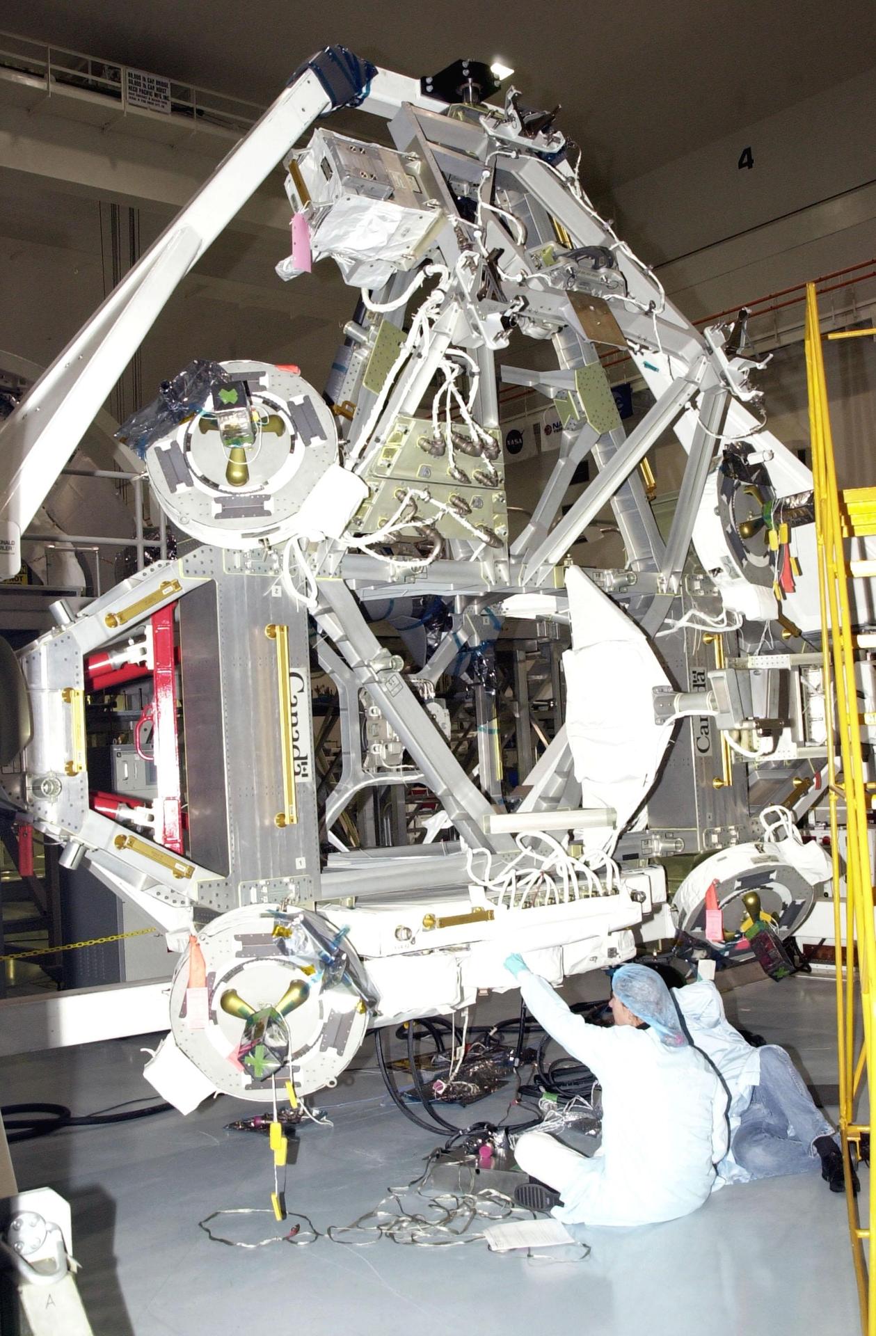 KENNEDY SPACE CENTER, FLA. -- Workers in the Space Station Processing Facility check out components of over the Mobile Base System (MBS), part of the payload on mission STS-111 to the International Space Station. The MBS will be installed on the Mobile Transporter to complete the Canadian Mobile Servicing System, or MSS. The mechanical arm will then have the capability to "inchworm" from the U.S. Lab Destiny to the MSS and travel along the truss to work sites. STS-111 is the second utilization flight (UF-2) to the Space Station and will also carry the Expedition 5 crew to replace Expedition 4. Launch is scheduled for May 2, 2002