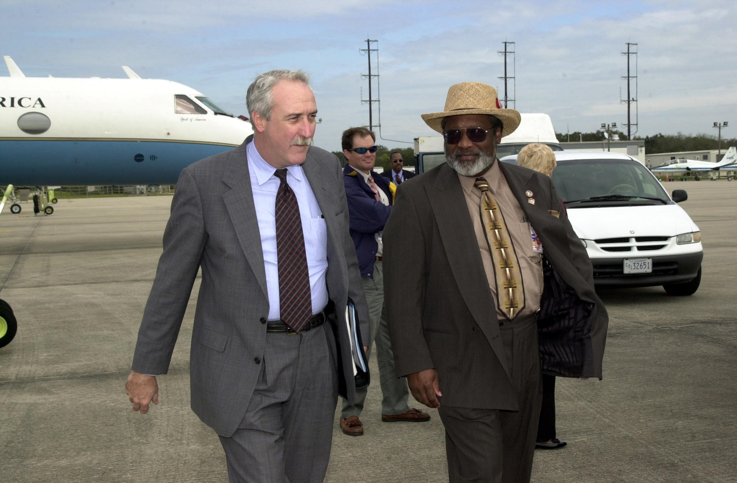 KENNEDY SPACE CENTER, FLA. -- Striding across the parking apron at the KSC Shuttle Landing Facility are the new NASA Administrator Sean O'Keefe (left) and KSC's Deputy Director James Jennings (right). O'Keefe has just arrived at KSC as part of his tour of agency field centers. He was nominated for the position as administrator in November 2001 by President George W. Bush. He was sworn in Dec. 21 as the agency's 10th chief