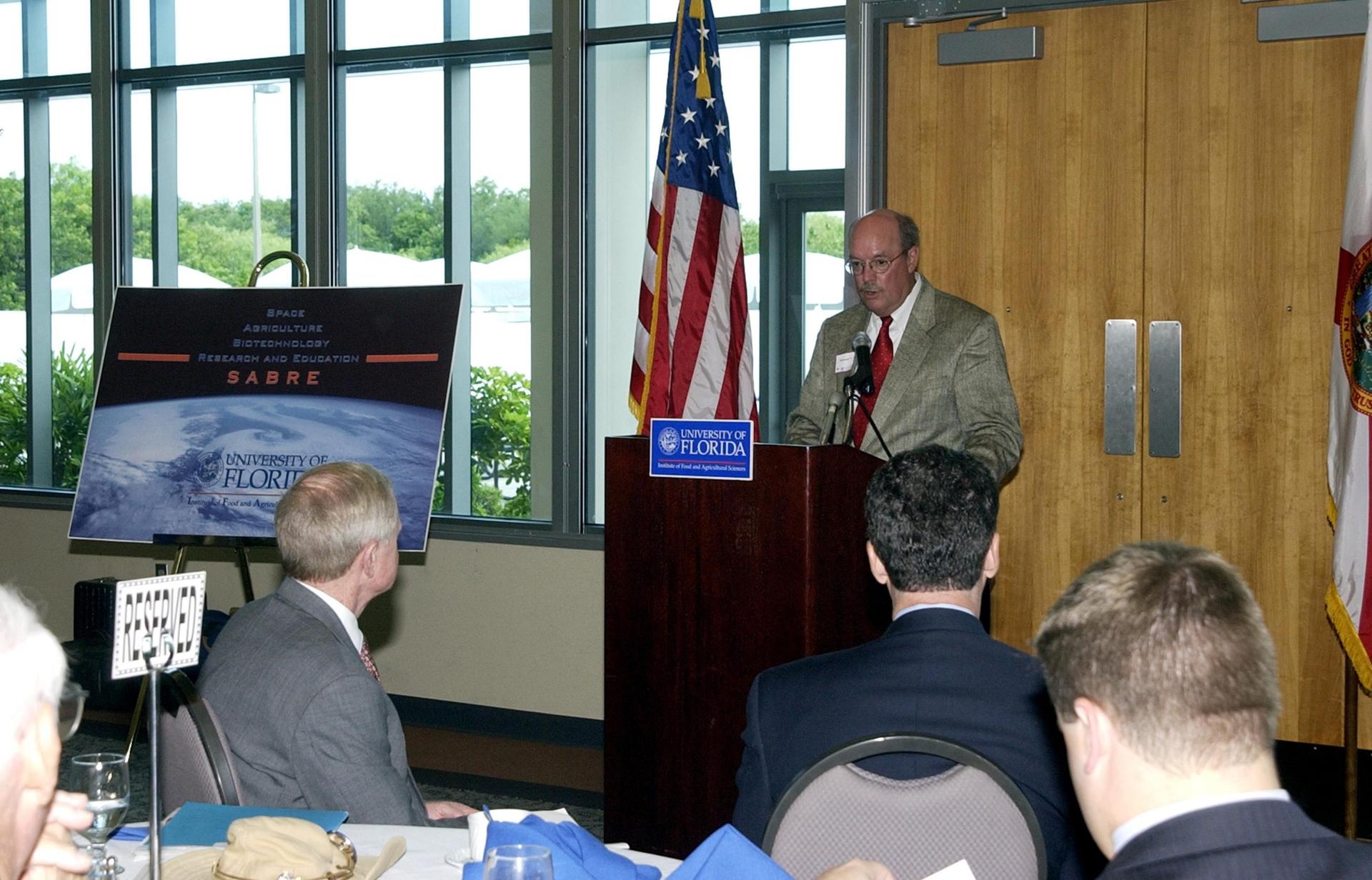 KENNEDY SPACE CENTER, FLA. -- Mike Martin, University of Florida vice president for agriculture and natural resources, speaks during the opening ceremony to launch a new program called SABRE, Space Agricultural Biotechnology Research and Education, that involves UF and NASA. Officials from UF and NASA attended the event. In the foreground are Center Director Roy D. Bridges Jr. (left) and U.S. Rep. Dave Weldon (right). SABRE will focus on the discovery, development and application of the biological aspects of advanced life support strategies. The program will include faculty from UF's Institute of Food and Agricultural Sciences, who will be located at both KSC - in the state-owned Space Experiment Research and Processing Laboratory (SERPL) being built there - and UF in Gainesville. SABRE will be directed by Robert Ferl, professor in the horticultural sciences department and assistant director of UF's Biotechnology Program. He will be responsible for coordinating the research and education efforts of UF and NASA