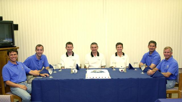 KENNEDY SPACE CENTER, FLA. -- The STS-111 and Expedition 5 crews relax at the traditional crew meal before getting ready for launch. Seated left to right are Mission Specialists Franklin Chang-Diaz and Philippe Perrin (CNES); cosmonauts Sergei Treschev (RSA) and Valeri Korzun (RSA) and astronaut Peggy Whitson, the Expedition 5 crew; Pilot Paul Lockhart and Commander Kenneth Cockrell. In front of them is the traditional cake. STS-111 is the second Utilization Flight to the International Space Station, carrying the Multi-Purpose Logistics Module Leonardo, the Mobile Base System (MBS), and a replacement wrist/roll joint for the Canadarm 2. Also onboard Space Shuttle Endeavour is the Expedition 5 crew who will replace Expedition 4 on board the Station. The MBS will be installed on the Mobile Transporter to complete the Canadian Mobile Servicing System, or MSS. The mechanical arm will then have the capability to "inchworm" from the U.S. Lab Destiny to the MSS and travel along the truss to work sites. Expedition 4 crew members will return to Earth with the STS-111 crew on Endeavour. Launch is scheduled at 7:44 p.m. EDT, May 30, 2002
