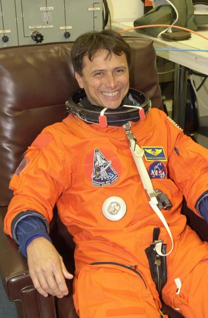KENNEDY SPACE CENTER, FLA. -- STS-111 Mission Specialist Franklin Chang-Diaz suits up for launch, scheduled at 7:44 p.m. EDT, May 30, 2002. This is his seventh Shuttle flight, only the second astronaut to achieve that number. STS-111 is the second Utilization Flight to the International Space Station, carrying the Multi-Purpose Logistics Module Leonardo, the Mobile Base System (MBS), and a replacement wrist/roll joint for the Canadarm 2. Also onboard Space Shuttle Endeavour is the Expedition 5 crew who will replace Expedition 4 on board the Station. The MBS will be installed on the Mobile Transporter to complete the Canadian Mobile Servicing System, or MSS. The mechanical arm will then have the capability to "inchworm" from the U.S. Lab Destiny to the MSS and travel along the truss to work sites. Expedition 4 crew members will return to Earth with the STS-111 crew on Endeavour
