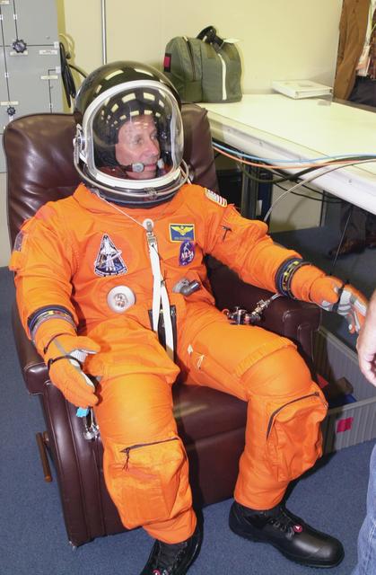 KENNEDY SPACE CENTER, FLA. - STS-111 Commander Kenneth Cockrell suits up for the scheduled liftoff of Space Shuttle Endeavour at 7:44 p.m. EDT. This is Cockrell's fifth Shuttle flight. STS-111 is the second Utilization Flight to the International Space Station, carrying the Multi-Purpose Logistics Module Leonardo, the Mobile Base System (MBS), and a replacement wrist/roll joint for the Canadarm 2. The MBS will be installed on the Mobile Transporter to complete the Canadian Mobile Servicing System, or MSS. In addition, Expedition 5 is traveling on mission STS-111 to the International Space Station to replace the current resident crew, Expedition 4, who will return to Earth with the STS-111 crew