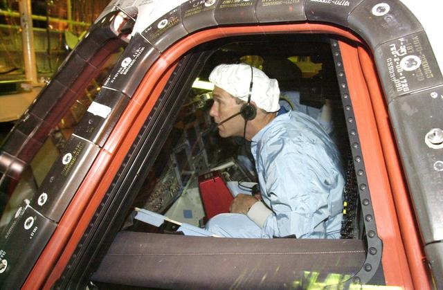 KENNEDY SPACE CENTER, FLA. - STS-107 Commander Rick Husband checks the window in Columbia during Crew Equipment Interface Test activities at KSC. The CEIT includes equipment and payload familiarization. STS-107 is a research mission, with the SHI Research Double Module (SHI/RDM), also known as SPACEHAB, as the primary payload, plus the Fast Reaction Experiments Enabling Science, Technology, Applications and Research (FREESTAR) that incorporates eight high priority secondary attached shuttle experiments. STS-107 is scheduled to launch July 19, 2002