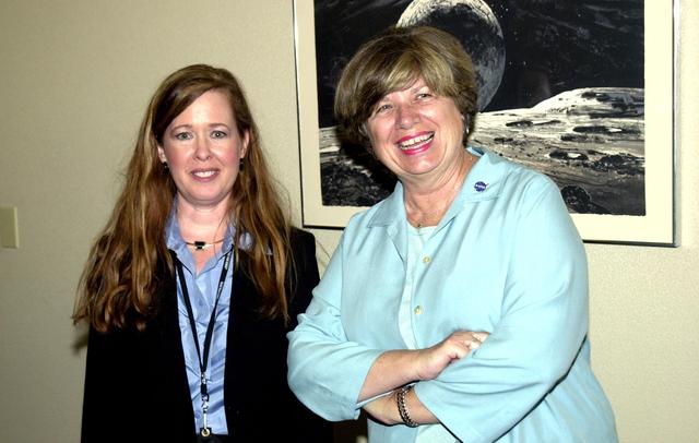KENNEDY SPACE CENTER, FLA. -- External Relations and Business Development Division Chief Lisa Malone (left) and Director JoAnn Morgan take a break during the 2002 Florida Press Association and Florida Society of Newspaper Editors Convention held at the Debus Center, KSC Visitors Complex. Serving as keynote speaker for the event was NASA Associate Deputy Administrator Dr. Daniel Mulville. Center Director Roy D. Bridges Jr. also addressed attendees and kicked off a tour of the Center