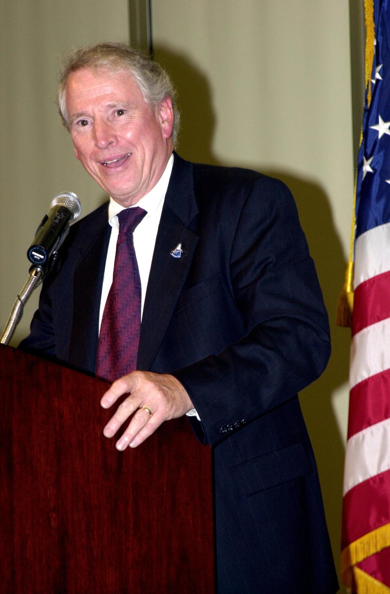KENNEDY SPACE CENTER, FLA. -- NASA Associate Deputy Administrator Dr. Daniel Mulville addresses attendees of the 2002 Florida Press Association and Florida Society of Newspaper Editors Convention held at the Debus Center, KSC Visitors Complex. Mulville was the keynote speaker. Center Director Roy D. Bridges Jr. also addressed attendees and kicked off a tour of the Center