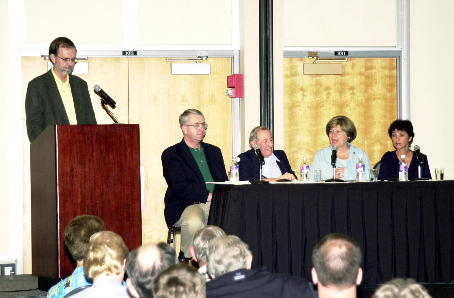 KENNEDY SPACE CENTER, FLA. -- The 2002 Florida Press Association and Florida Society of Newspaper Editors Convention offers a panel on space. At the podium is Bob Stover, managing editor, Florida Today. Seated on the panel are (left to right) Craig Covault, senior editor, Aviation Week; Howard Benedict, retired AP reporter; JoAnn Morgan, director, External Relations and Business Development, Kennedy Space Center; Marcia Dunn, AP reporter. The convention was held at the Debus Center, KSC Visitors Complex. Also speaking at the convention were Center Director Roy Bridges and NASA Associate Deputy Administrator Dr. Daniel Mulville