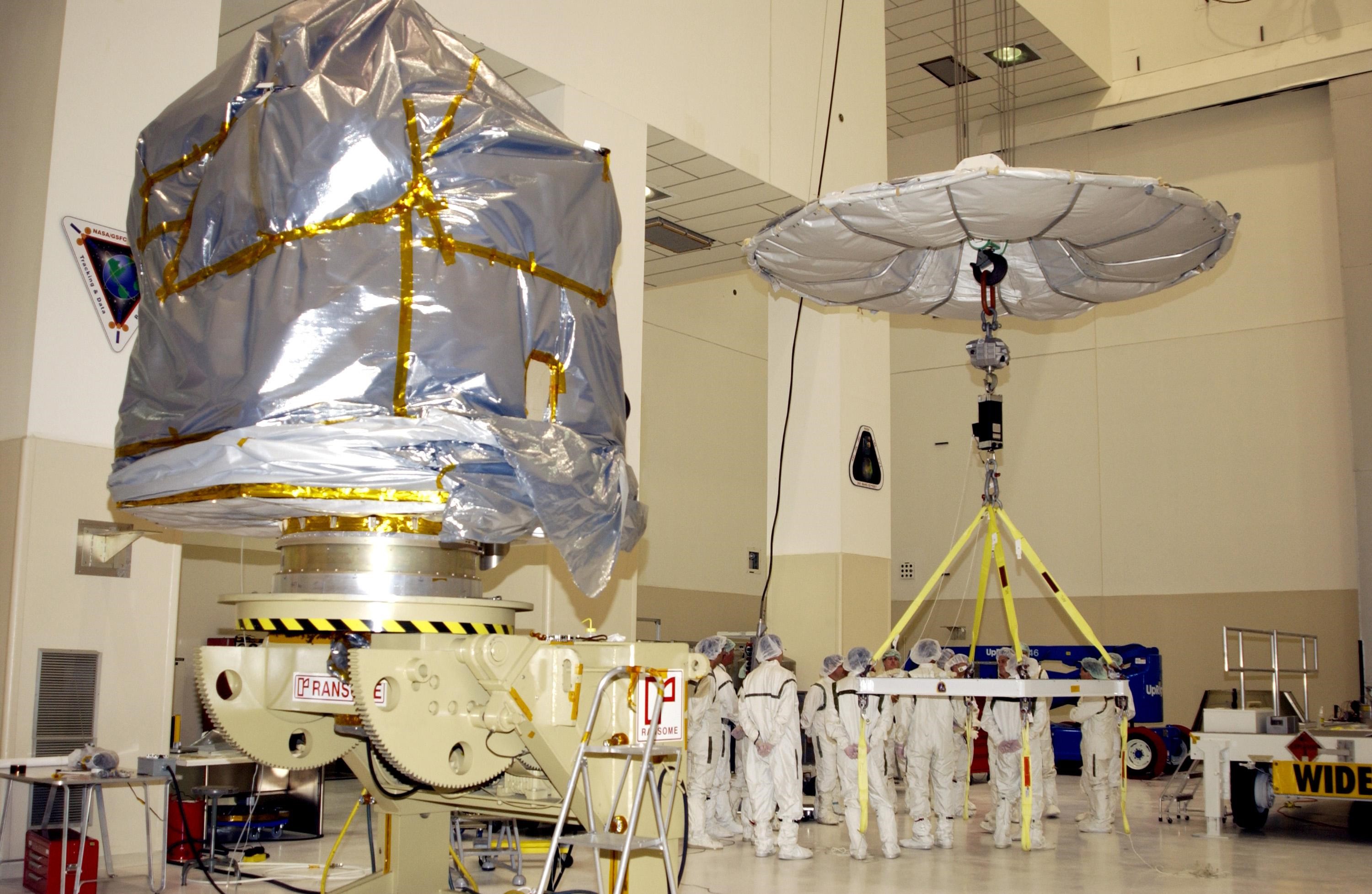KENNEDY SPACE CENTER, FLA. -- In the Space Assembly and Encapsulation Facility 2 (SAEF-2), the Comet Nucleus Tour (CONTOUR) spacecraft (left) is wrapped and ready for the crane at right to carry it to the upper stage of a Boeing Delta II rocket for mating. CONTOUR will provide the first detailed look into the heart of a comet -- the nucleus. Flying as close as 60 miles (100 kilometers) to at least two comets, the spacecraft will take the sharpest pictures yet of a nucleus while analyzing the gas and dust that surround these rocky, icy building blocks of the solar system. Launch of CONTOUR aboard the Delta II is scheduled for July 1, 2002, from Launch Complex 17-A, Cape Canaveral Air Force Station