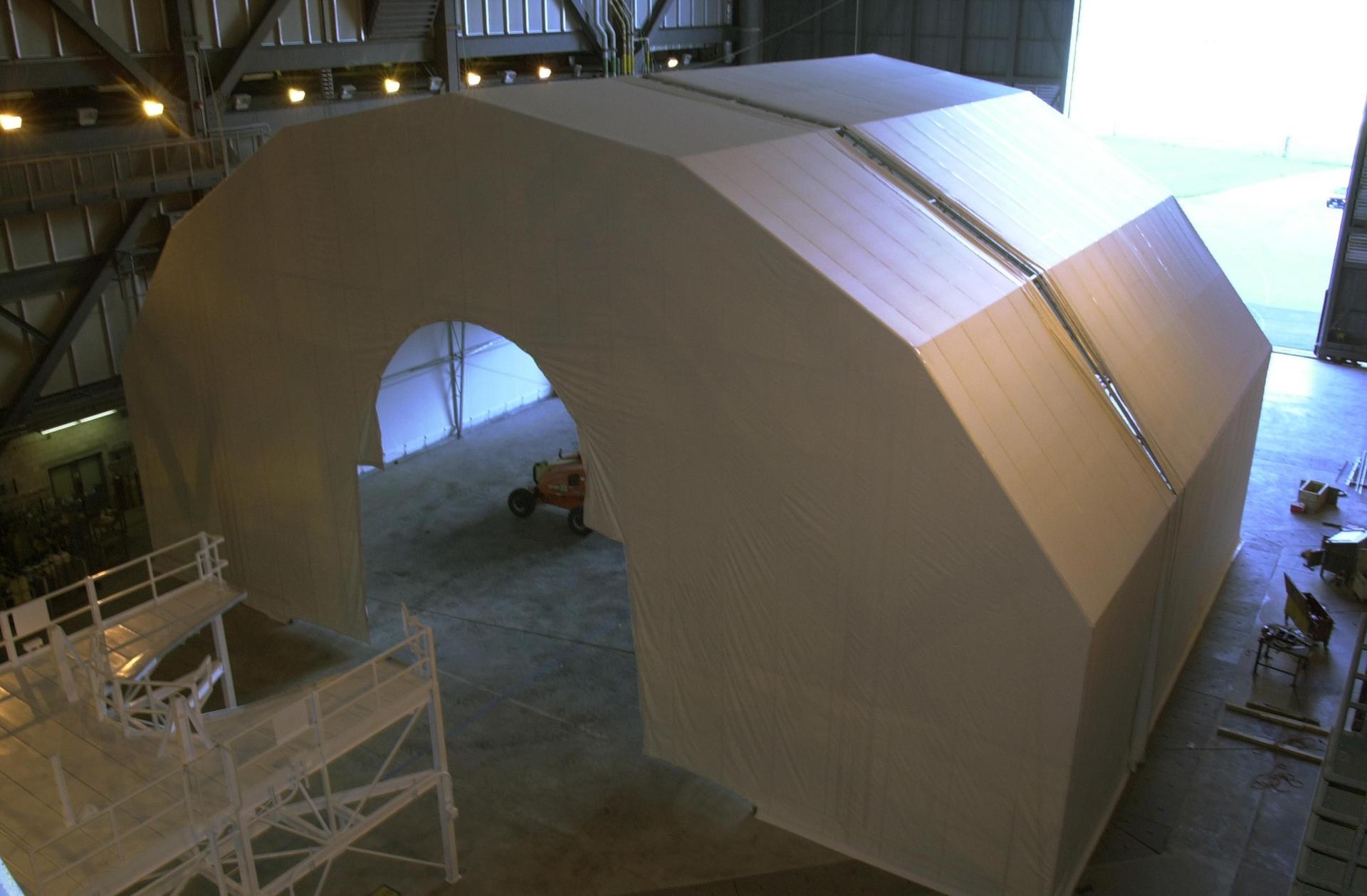 KENNEDY SPACE CENTER, FLA. -- -- In Vehicle Assembly Building (VAB) high bay 4, installation of a Payload Bay Door Drying Enclosure is in progress. The enclosure will keep moisture from being absorbed into the graphite epoxy used on the payload bay doors of the Shuttle orbiters with the assistance of mini-Portable Purge Units (PPUs). Once in operation, the enclosure will allow NASA the option to store an orbiter in the VAB bay up to 180 days in a "standby-to-stack" mode.
