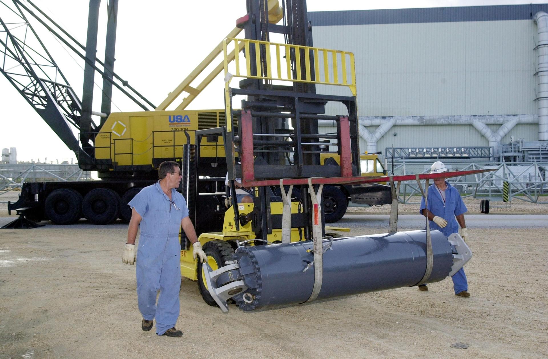 KENNEDY SPACE CENTER, FLA. -- Workers accompany the repaired Jacking, Equalization and Leveling (JEL) cylinder as it is moved from the repair site for installation into Crawler Transporter No. 2. There are 16 cylinders and 32 bearings per crawler. During recent routine maintenance inspections, technicians removed two of the 16 JEL cylinders on the crawler to gain access to the bearings and found three of the four bearings cracked. Further eddy current inspections indicated that cracks were present on 15 of the bearings.. Technicians have removed and replaced 14 of the bearings on CT-2, which is being repaired in order to enable Atlantis' rollout for mission STS-112, scheduled for launch no earlier than Oct. 2.