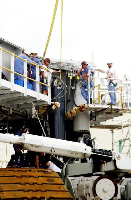 KENNEDY SPACE CENTER, FLA. -- Near the bottom of the repaired Jacking, Equalization and Leveling (JEL) cylinder, workers fasten the JEL to Crawler Transporter No. 2. There are 16 cylinders and 32 bearings per crawler. During recent routine maintenance inspections, technicians removed two of the 16 JEL cylinders on the crawler to gain access to the bearings and found three of the four bearings cracked. Further eddy current inspections indicated that cracks were present on 15 of the bearings.. Technicians have removed and replaced 14 of the bearings on CT-2, which is being repaired in order to enable Atlantis' rollout for mission STS-112, scheduled for launch no earlier than Oct. 2.