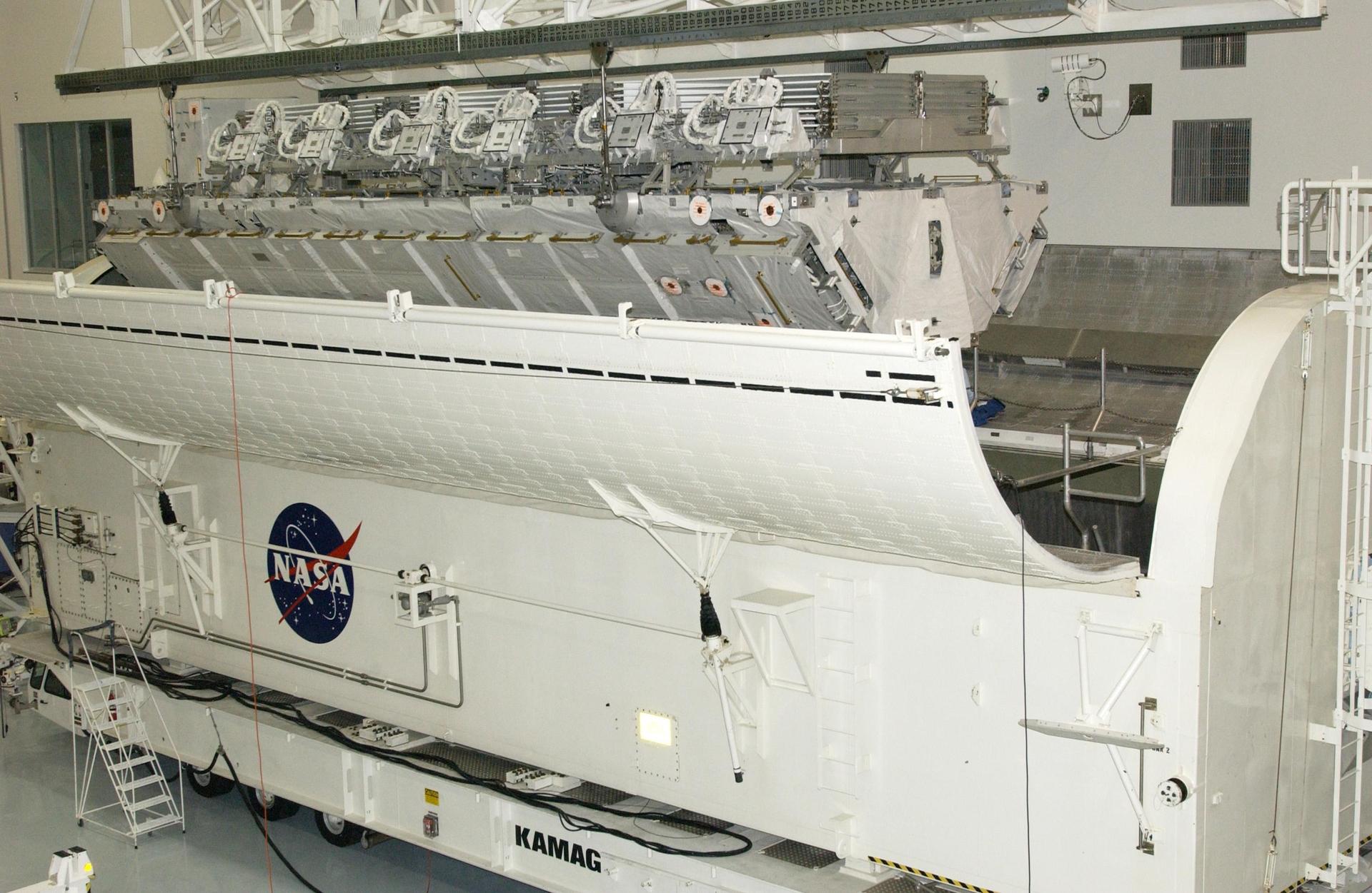 KENNEDY SPACE CENTER, FLA. -- The S1 Integrated Truss Structure is lowered into the payload canister for transport to Atlantis. The first starboard truss segment, the S1 will be attached to the Central truss segment, the S0 Truss, on the International Space Station during mission STS-112. Atlantis is scheduled to launch no earlier than Oct. 2.