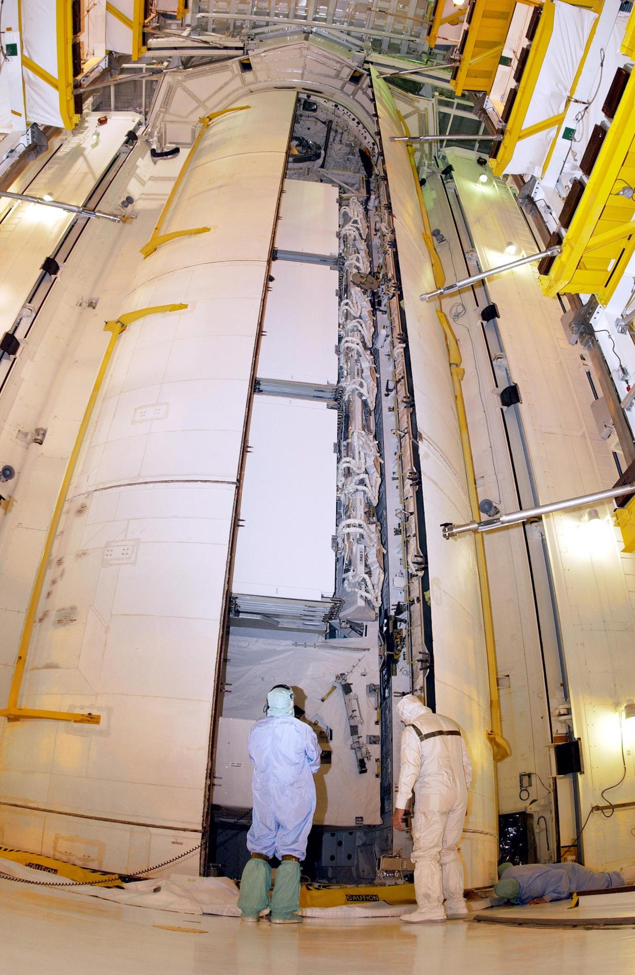 KENNEDY SPACE CENTER, FLA. -- The payload bay doors of Space Shuttle Atlantis close on the primary payloads for mission STS-112. The Shuttle is carrying the S1 Integrated Truss Structure, the first starboard truss segment, to be attached to the central truss segment, S0, plus the Crew and Equipment Translation Aid (CETA) Cart A. The CETA is the first of two human-powered carts that will ride along the ISS railway, providing mobile work platforms for future spacewalking astronauts. Launch of Atlantis is scheduled for Oct. 2 with a crew of six. The 11-day mission includes three spacewalks.