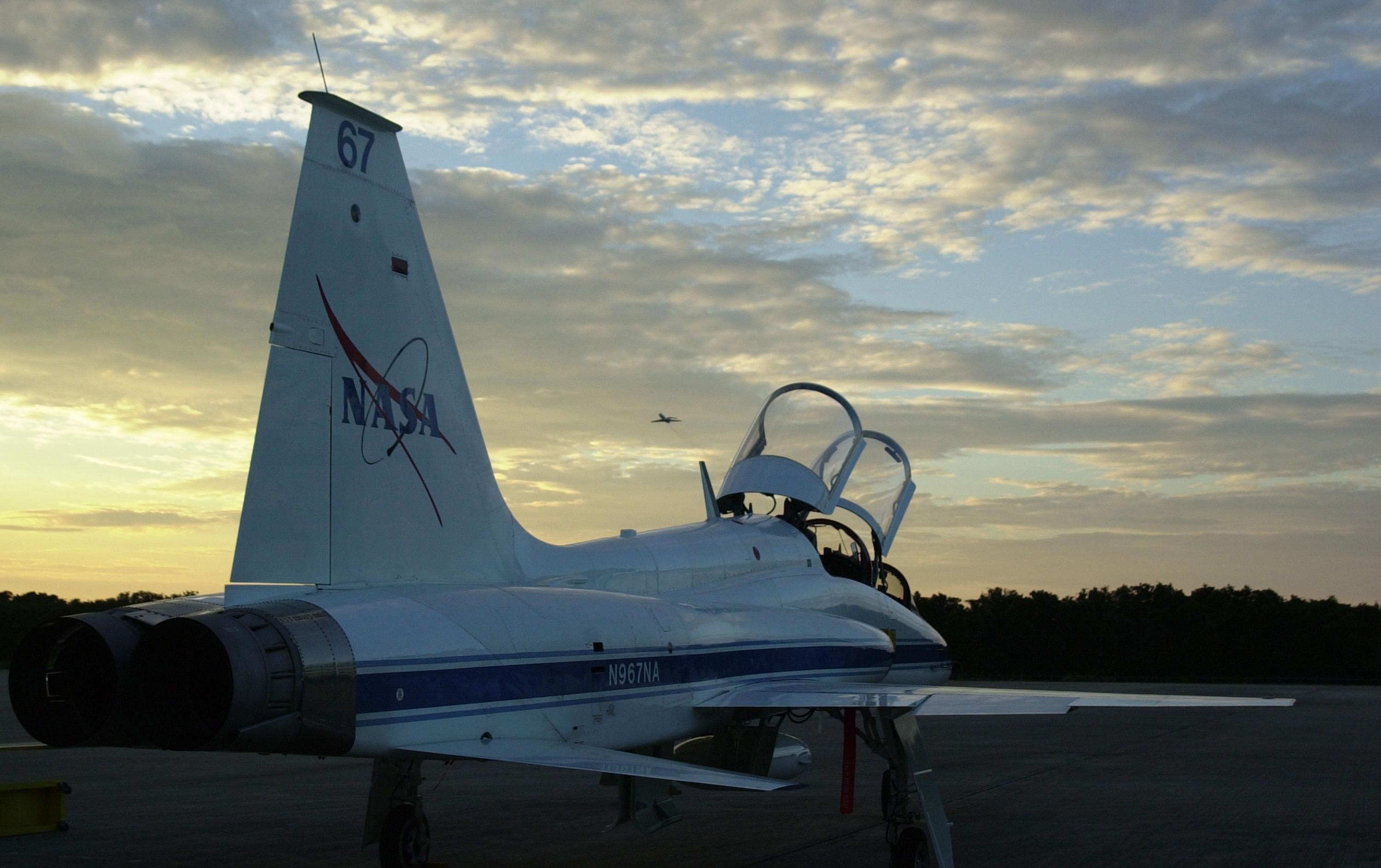 KENNEDY SPACE CENTER, FLA. --Framed by a T-38 on the Shuttle Landing Facility, the Shuttle Training Aircraft can be seen in the distance against the sunset. Commander Jeffrey Ashby and Pilot Pamela Melroy are going through landing exercises on the SLF.