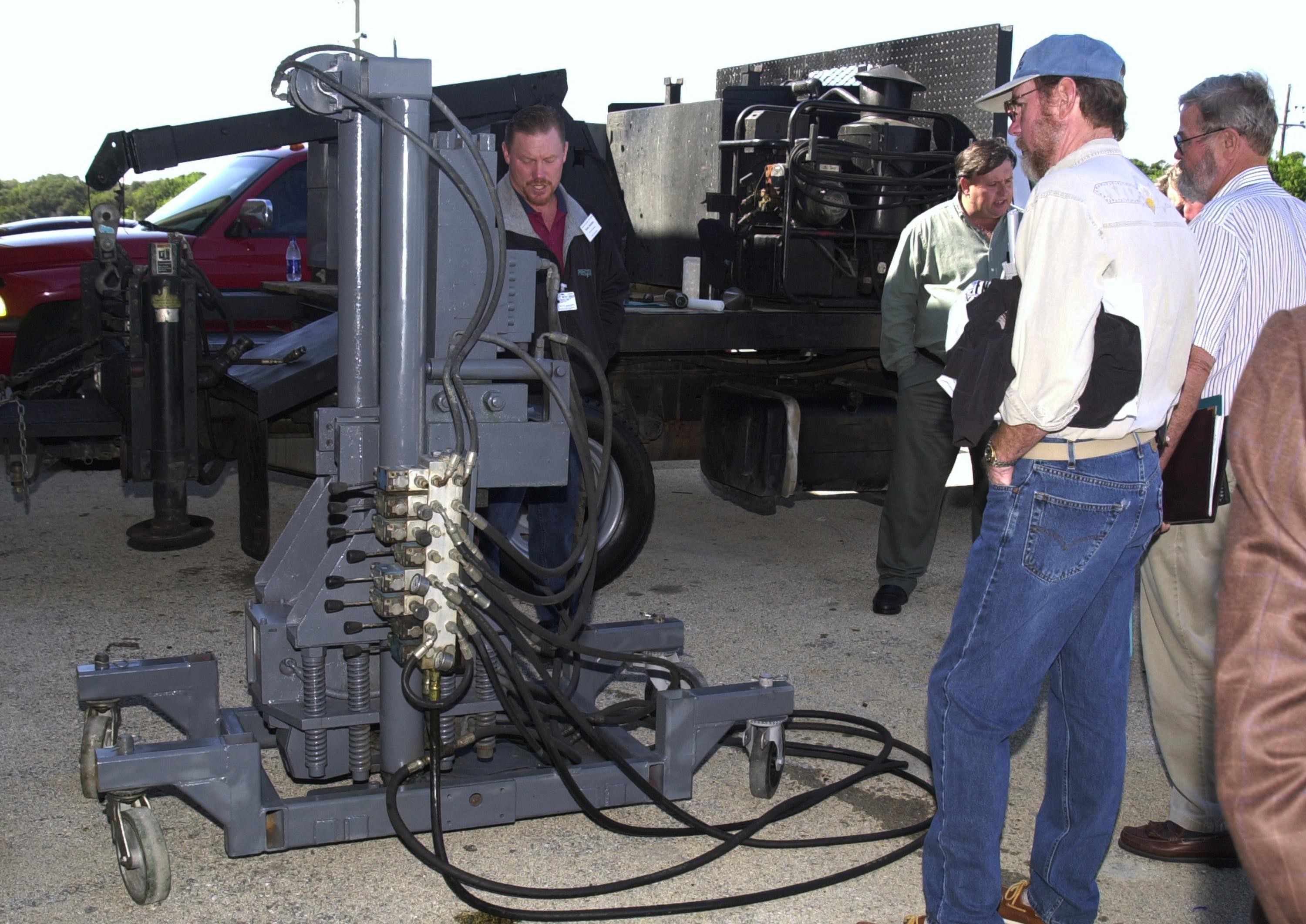 KENNEDY SPACE CENTER, FLA. - A touring group of national and international participants look over some Precision Sampling's drilling rig, new equipment being used for environmental cleanup at Launch Complex 34-A, Cape Canaveral Spaceport.