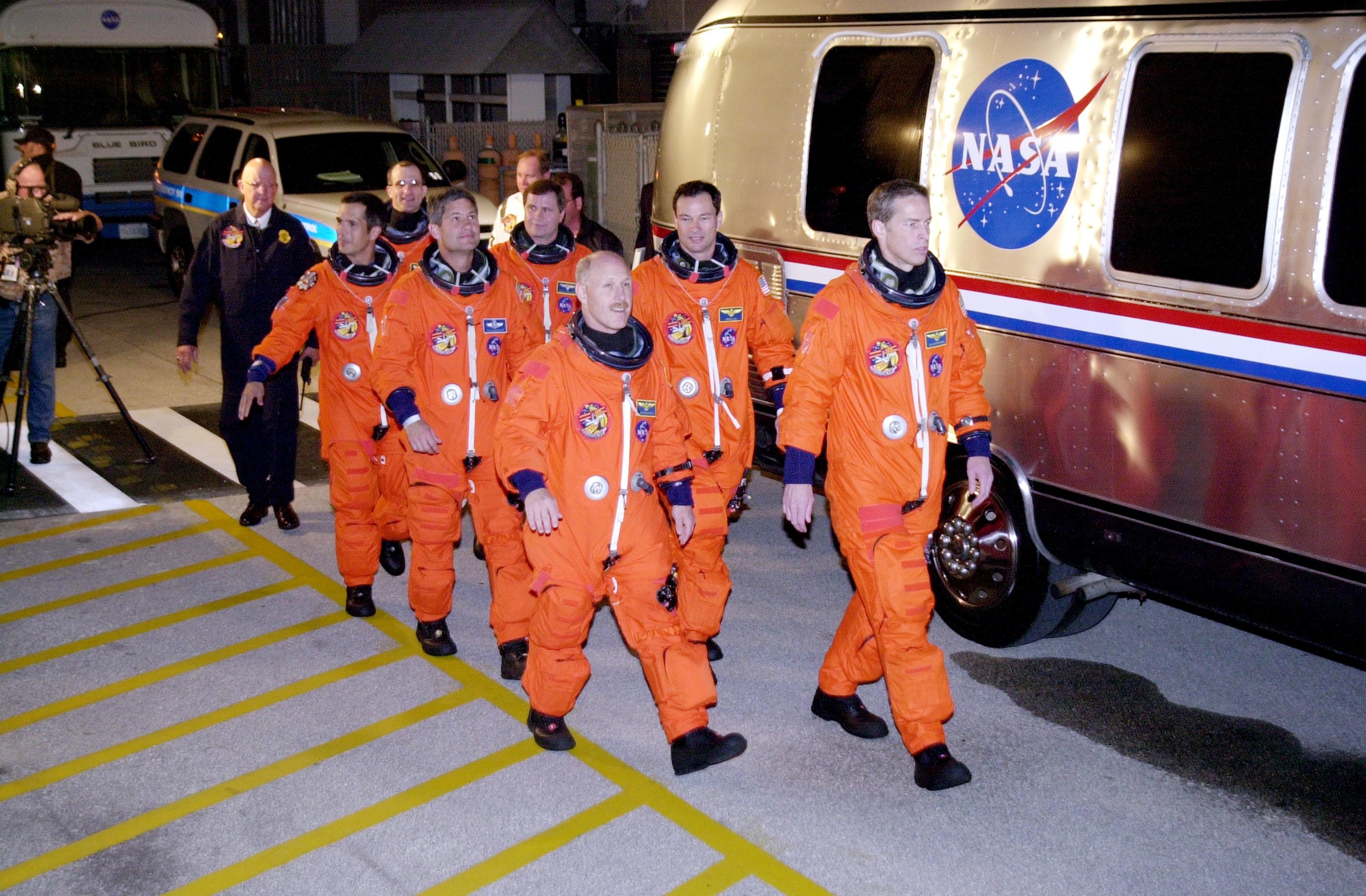 KENNEDY SPACE CENTER, FLA. -- The STS-113 and Expedition 6 crews head for the Astrovan that will take them to Launch Pad 39A and Space Shuttle Endeavour. In the foreground, from left to right, are Mission Specialist John Herrington, Pilot Paul Lockhart and Expedition 6 Commander Ken Bowersox. In the back, from left to right, are Expedition 6 flight engineers Donald Pettit and Nikolai Budarin, Mission Specialist Michael Lopez-Alegria and Commander James Wetherbee. The primary mission is bringing the Expedition 6 crew to the Station and returning the Expedition 5 crew to Earth. The major objective of the mission is delivery of the Port 1 (P1) Integrated Truss Assembly, which will be attached to the port side of the S0 truss. Three spacewalks are planned to install and activate the truss and its associated equipment. Launch of Space Shuttle Endeavour on mission STS-113 is scheduled for Nov. 11 at 12:58 a.m. EST.